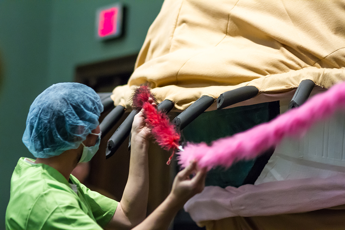 Six speakers or teams of speakers -- professors, doctors, and students from the Pittsburgh area and beyond -- spoke at this colloquium on a specific topic in the field of microbiology. Each lecturer was paired with an artist or group of artists to provide visual accompaniment, real time physical manifestations of the ideas and natural phenomena being discussed, to replace the standard projected powerpoint presentation. Visual performances and effects were created by Isla Hansen, Tucker Marder, Nick Fusaro, Britt Moseley, Jonathan Armistead, Zhiwan Cheung, and Dan Allende. Live theater and kinetic sculpture activated by artists and puppeteers brought microorganisms to life on a much larger scale.