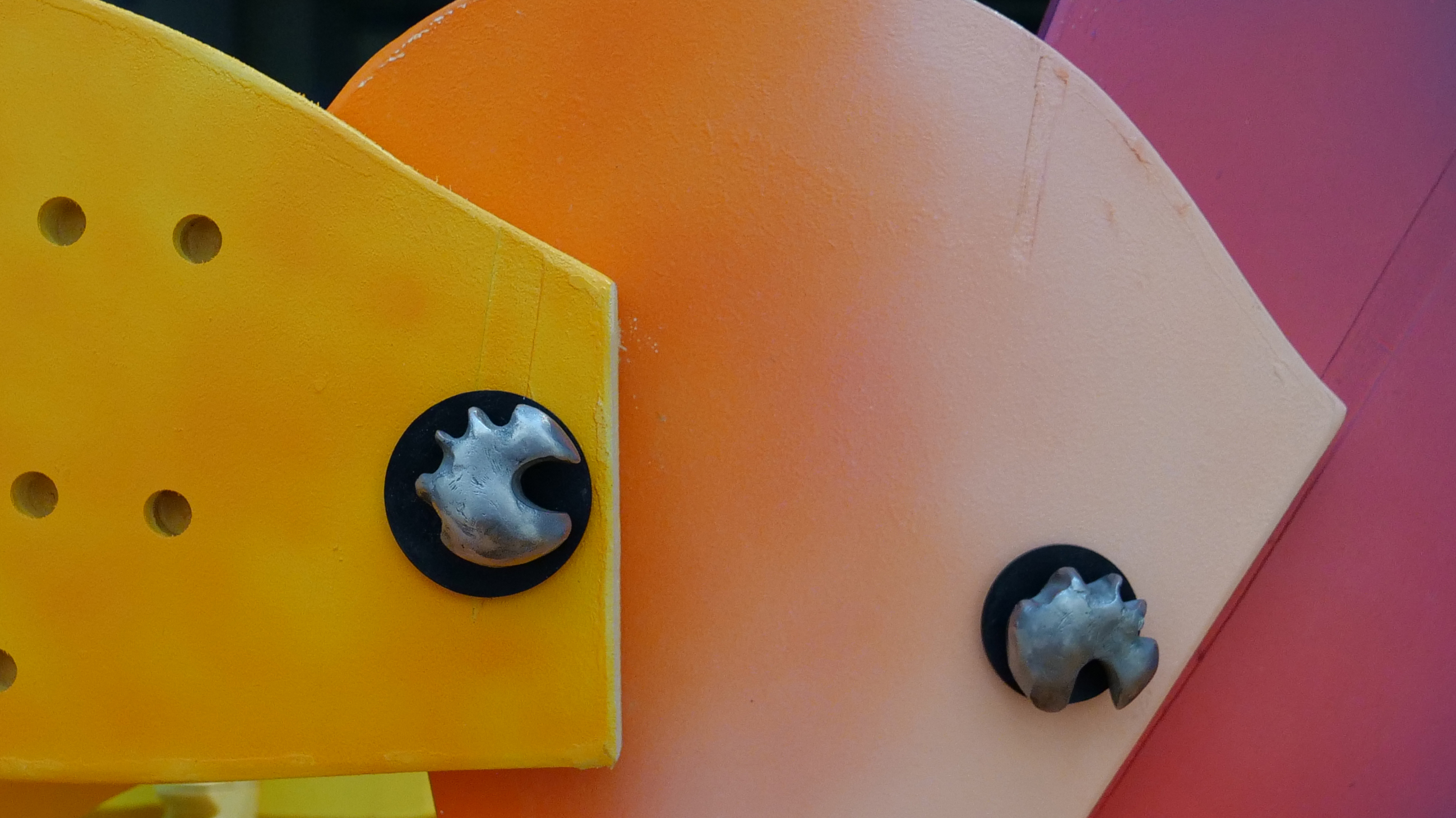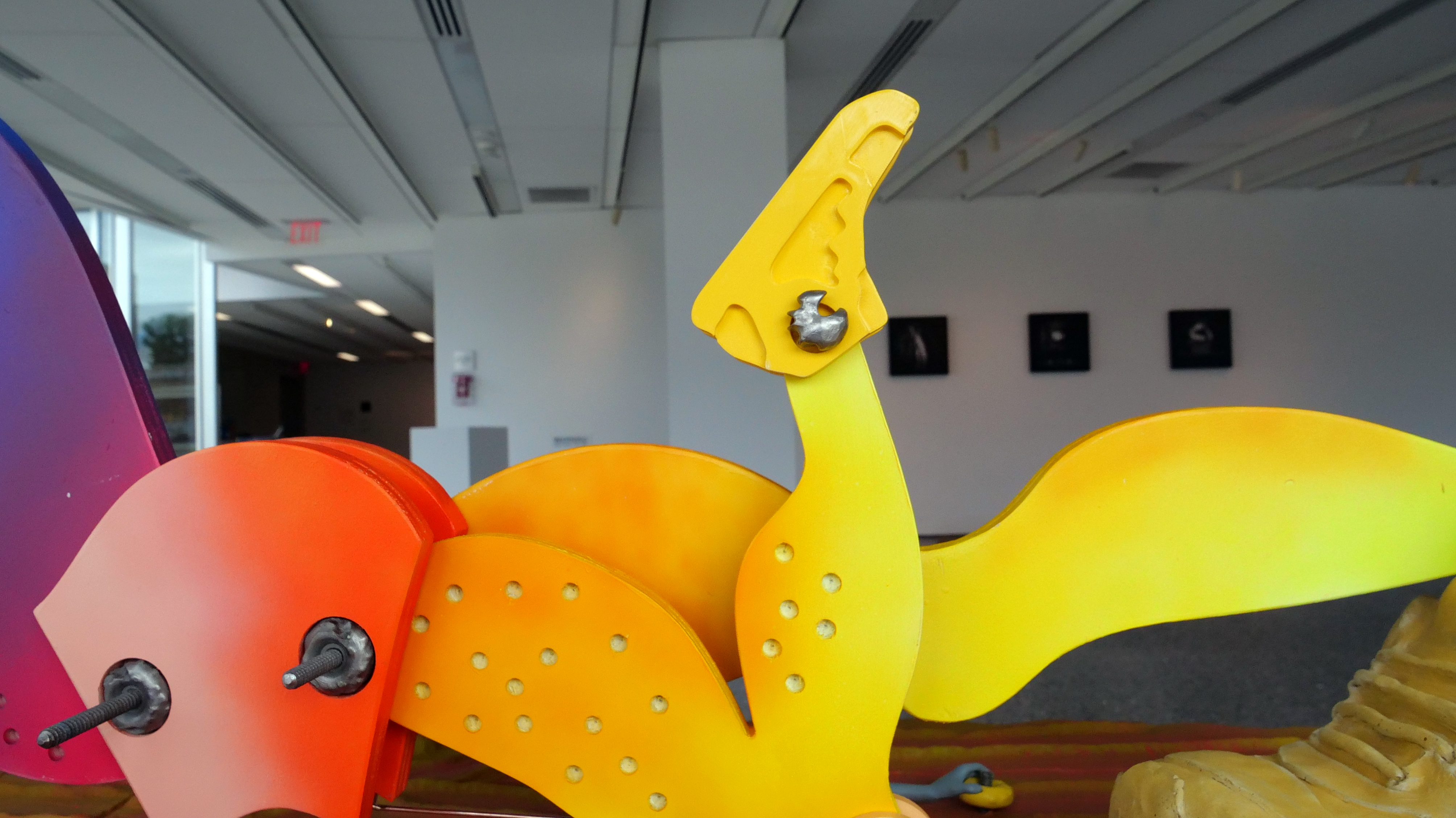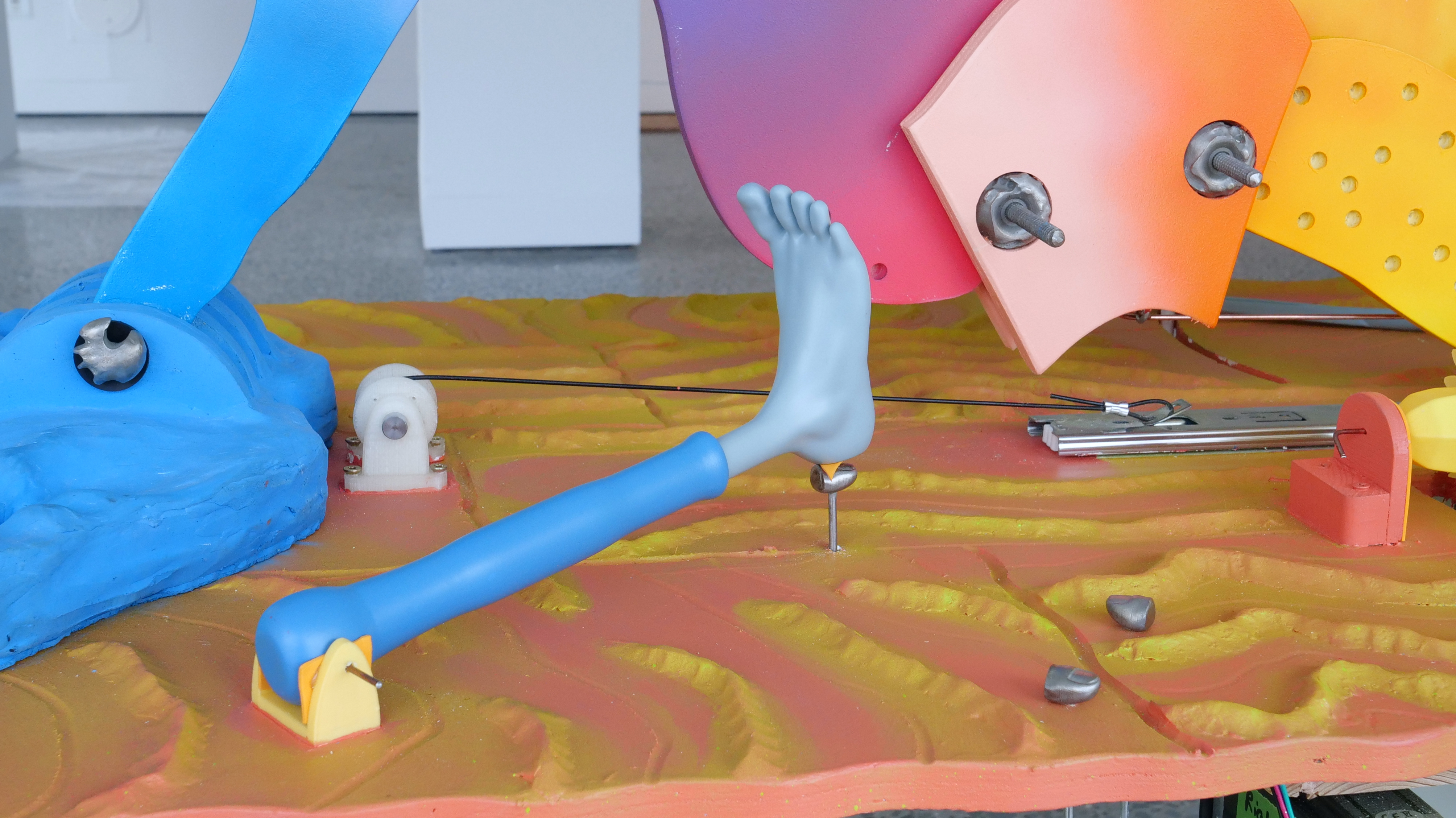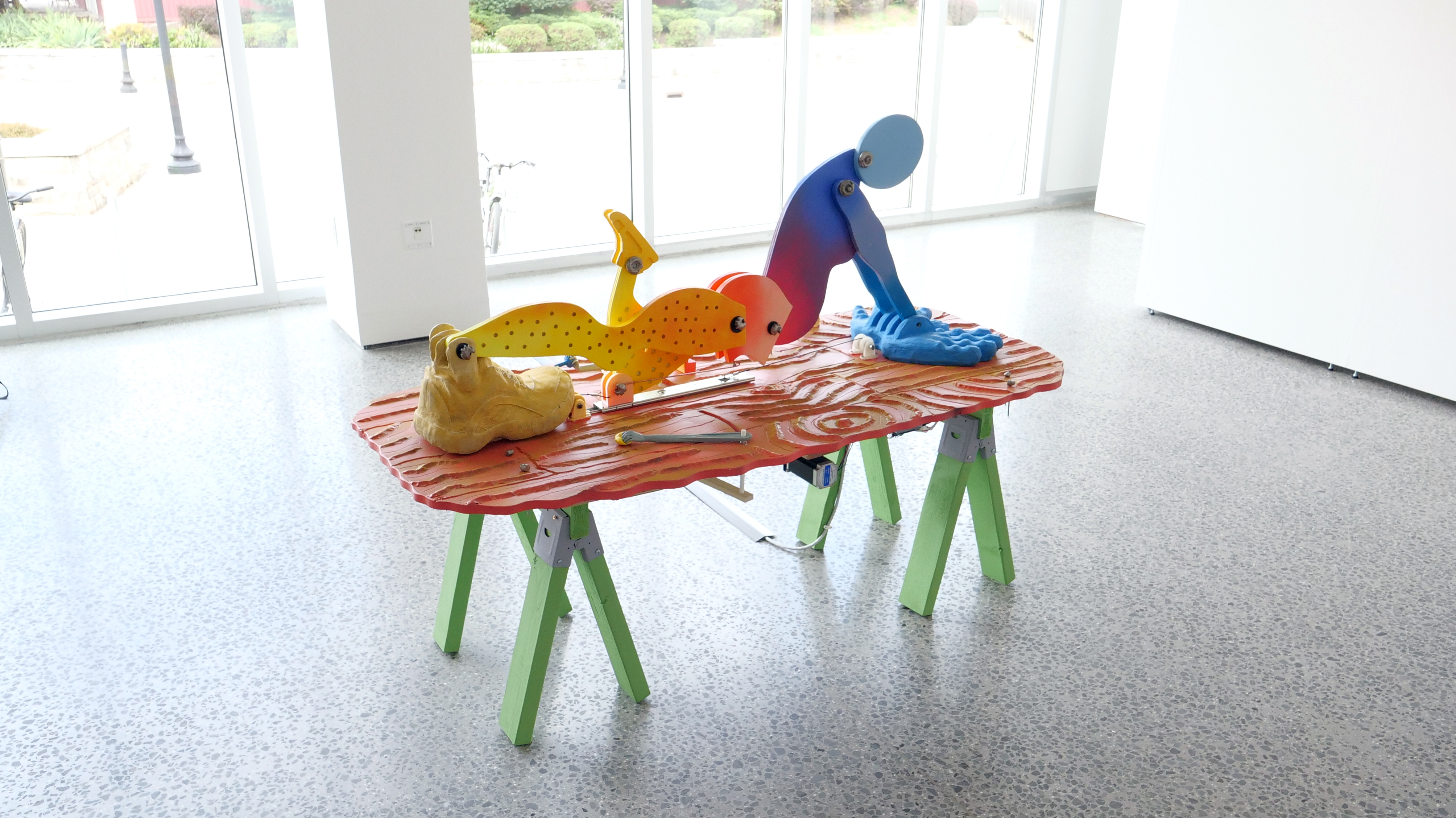 Media: kinetic sculpture with wood, paint, cast concrete, custom cast stainless steel, thermoplastic, stepper motor