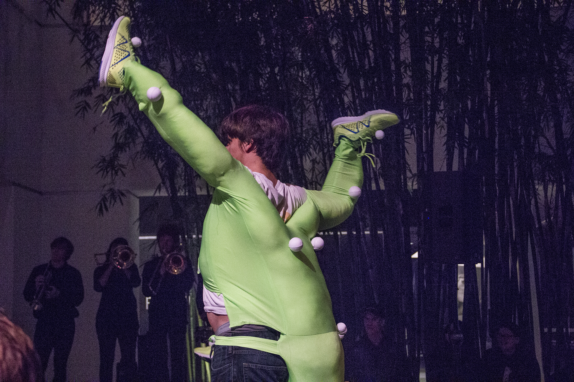 Puppetry of props including debris, satellites, sex toys, and jello salads was performed by Andrea Vitali and Miller Klitsner.