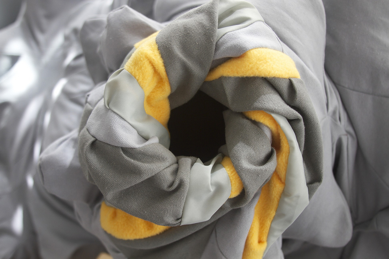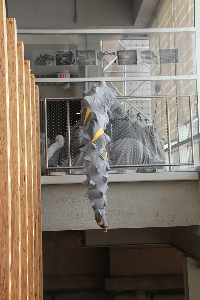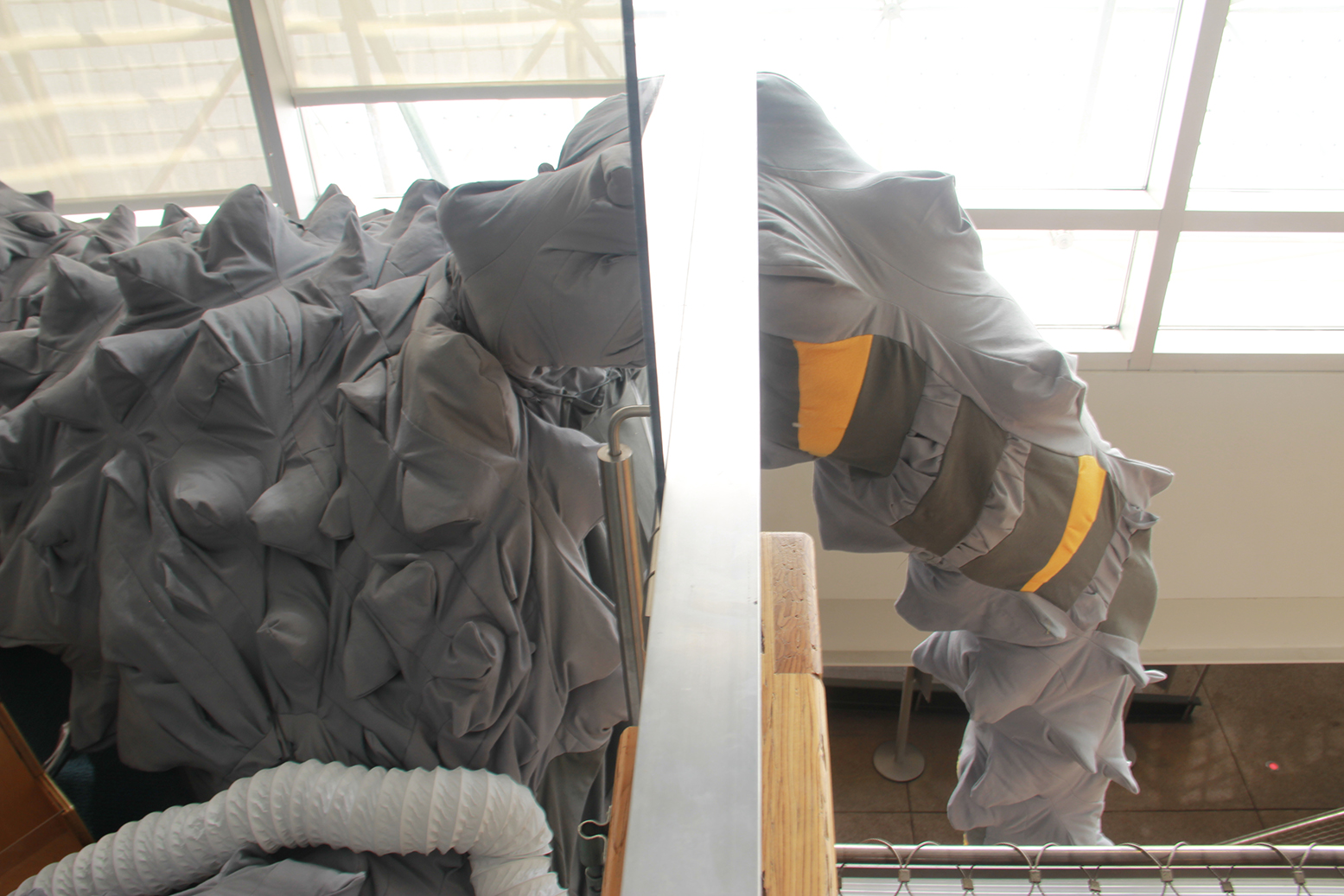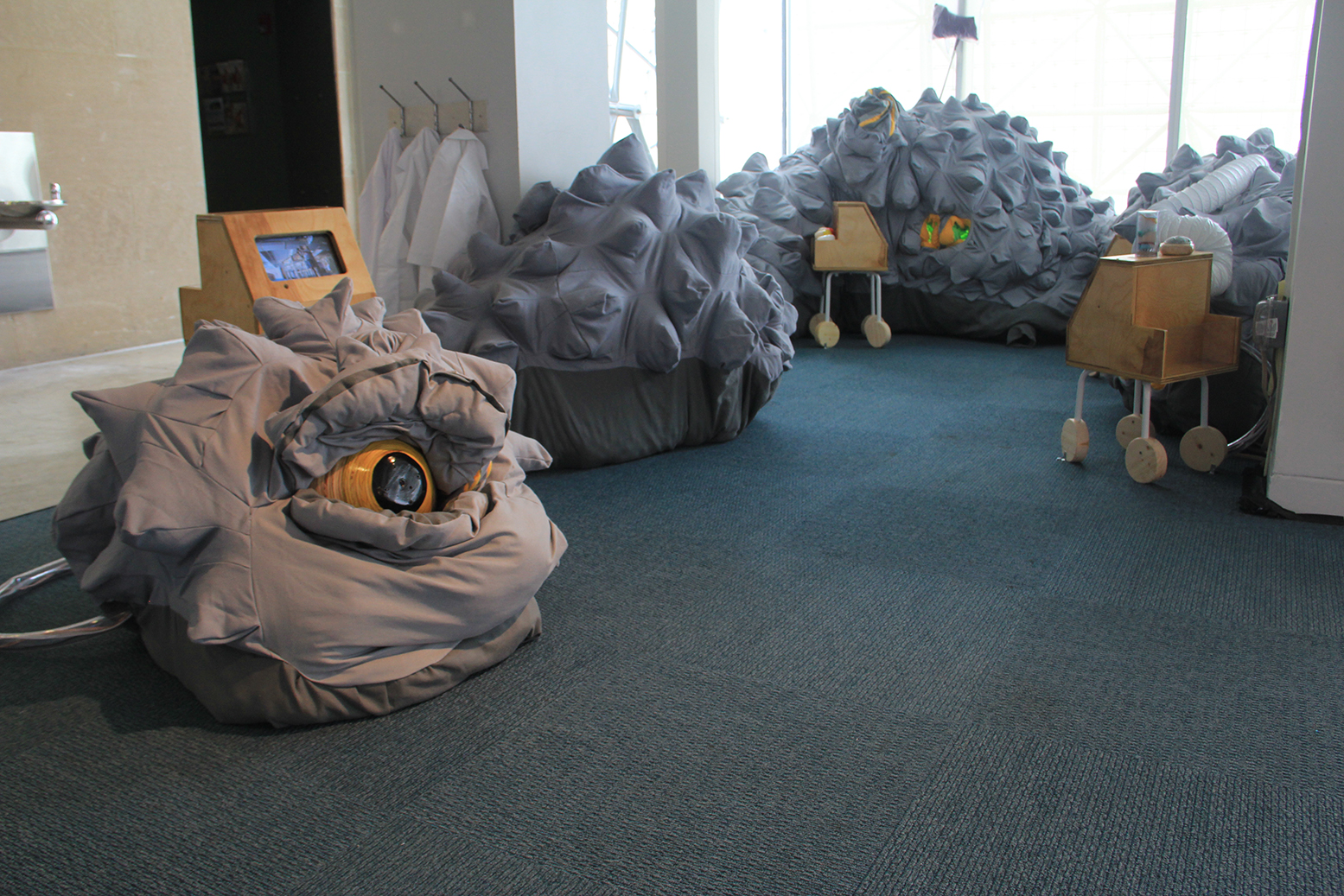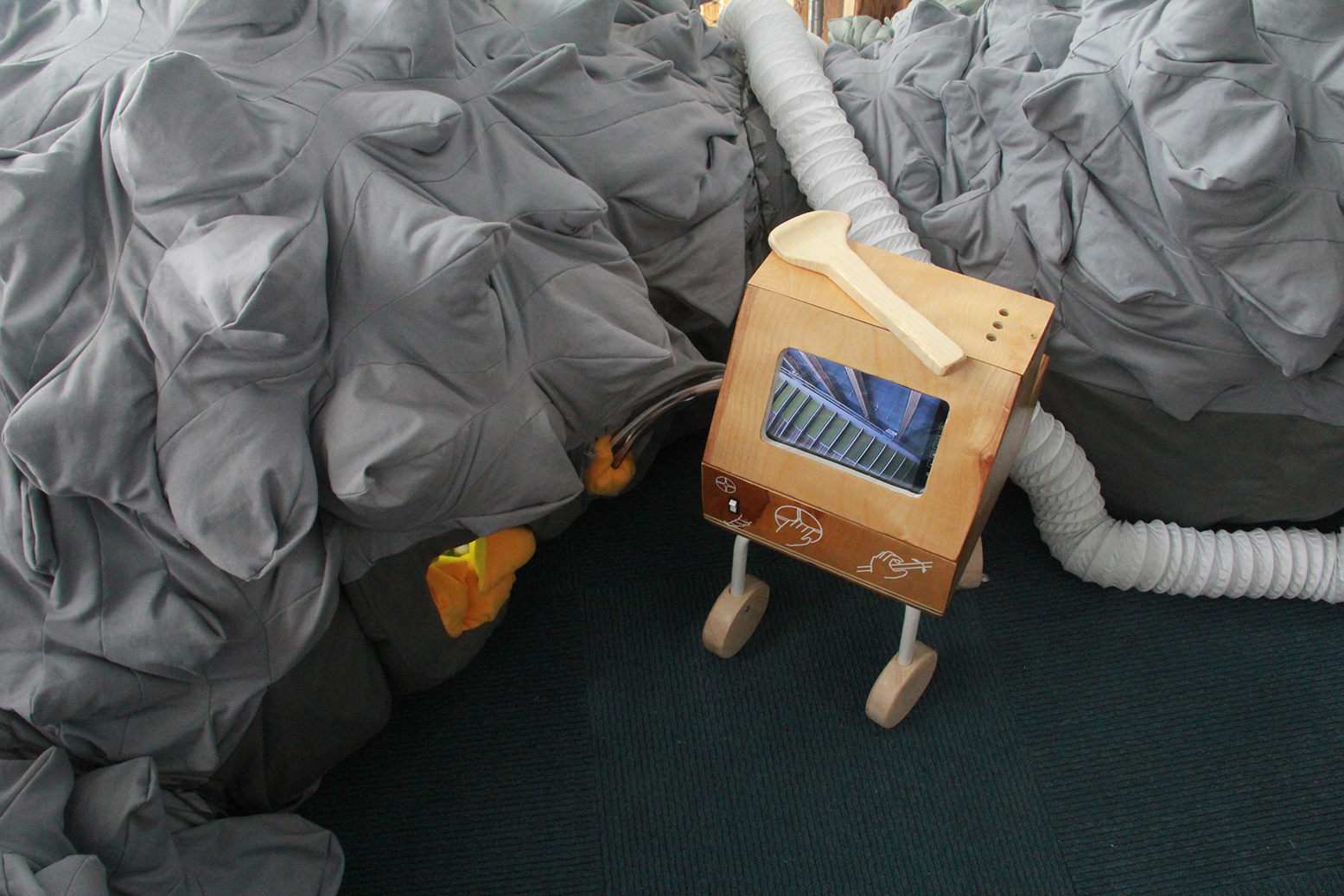 Media: interactive installation featuring wood, steel, aluminum, foam, cotton duck, felt, nylon, 5 CCTV systems, raspberry pi, custom software, magnets, blowers.