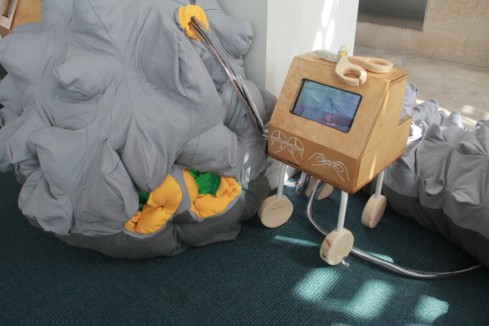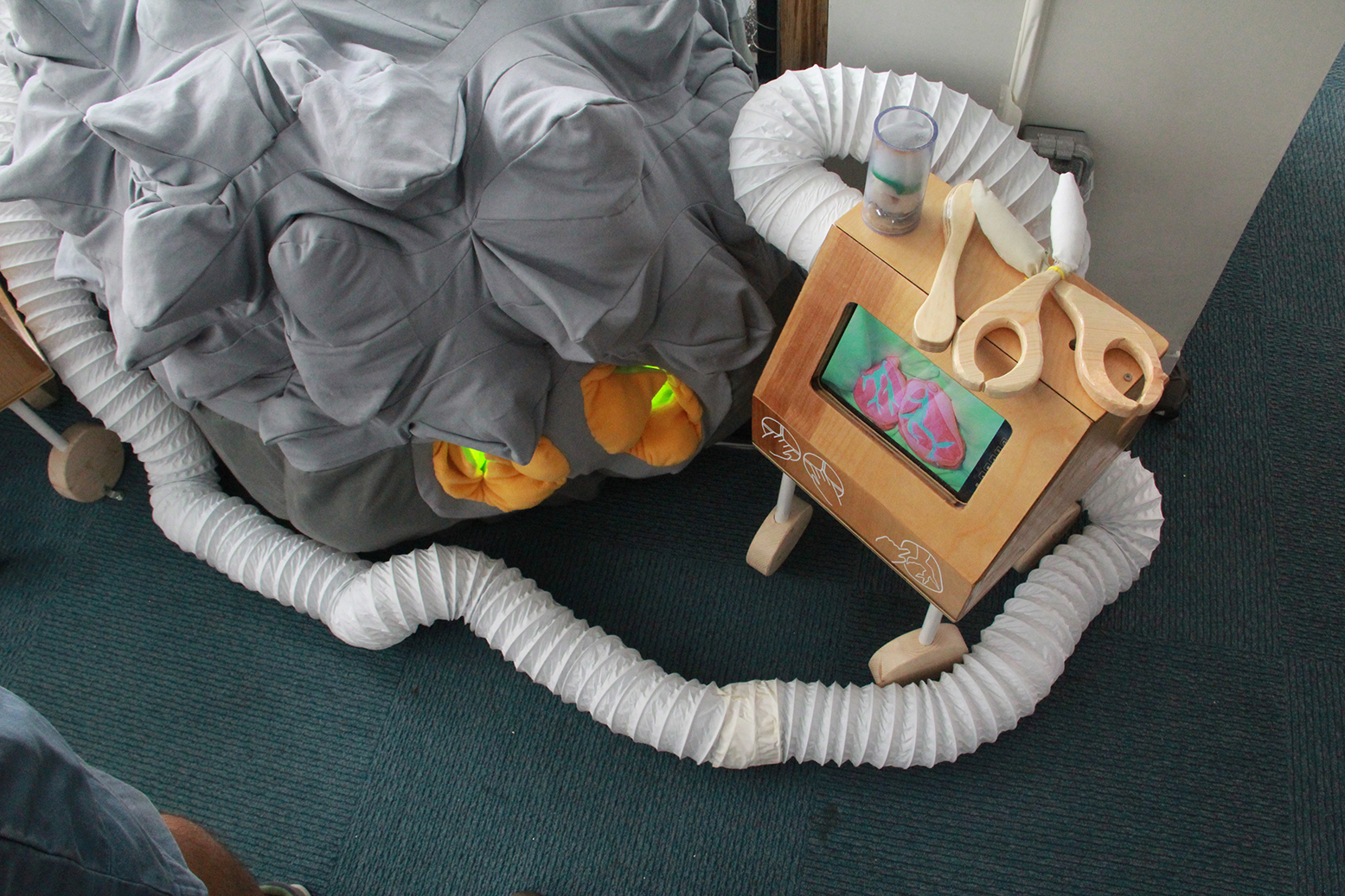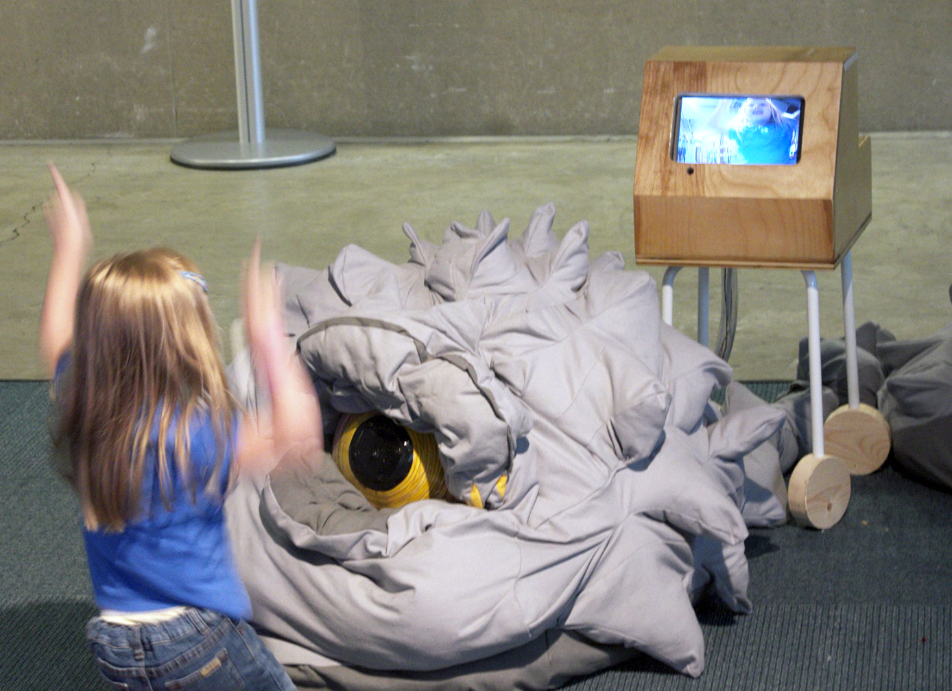 Monstroscopy is an interactive installation commissioned by the Children's Museum of Pittsburgh that allows visitors to perform endoscopic-like "surgery" on a giant monster of unknown origin. Inserting their hands through incisions, the audience may carry out playful surgical tasks inside the beast while watching their hands on CCTV monitors on small hospital carts. The monster may respond to certain touches in various ways, such as forming speech, breathing, and wagging its tale.