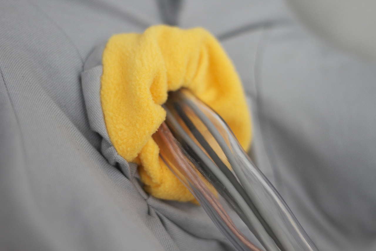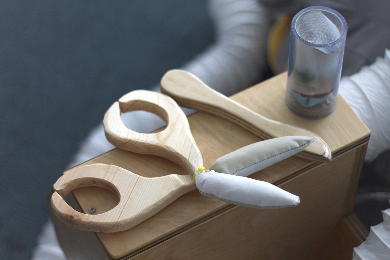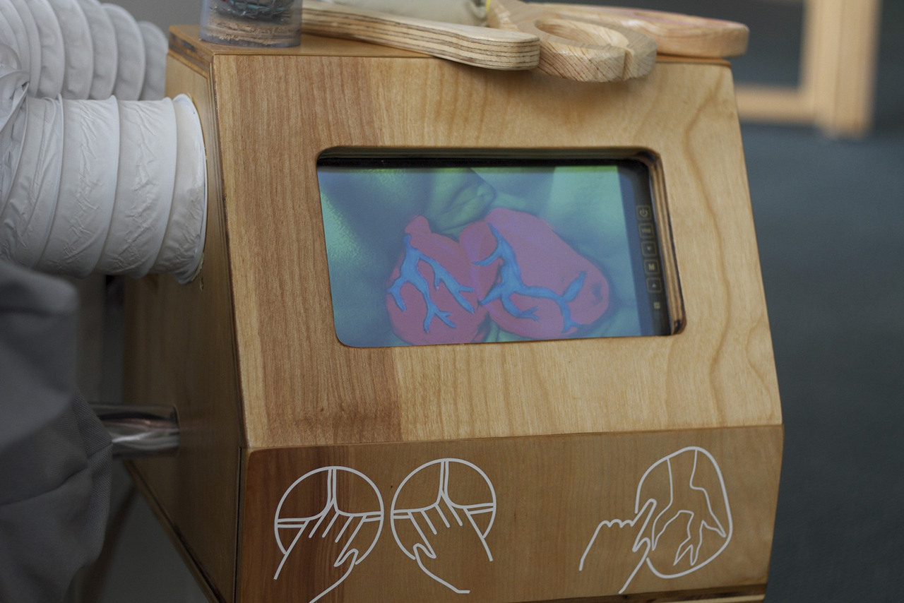 Monstroscopy is an interactive installation commissioned by the Children's Museum of Pittsburgh that allows visitors to perform endoscopic-like "surgery" on a giant monster of unknown origin. Inserting their hands through incisions, the audience may carry out playful surgical tasks inside the beast while watching their hands on CCTV monitors on small hospital carts. The monster may respond to certain touches in various ways, such as forming speech, breathing, and wagging its tale.