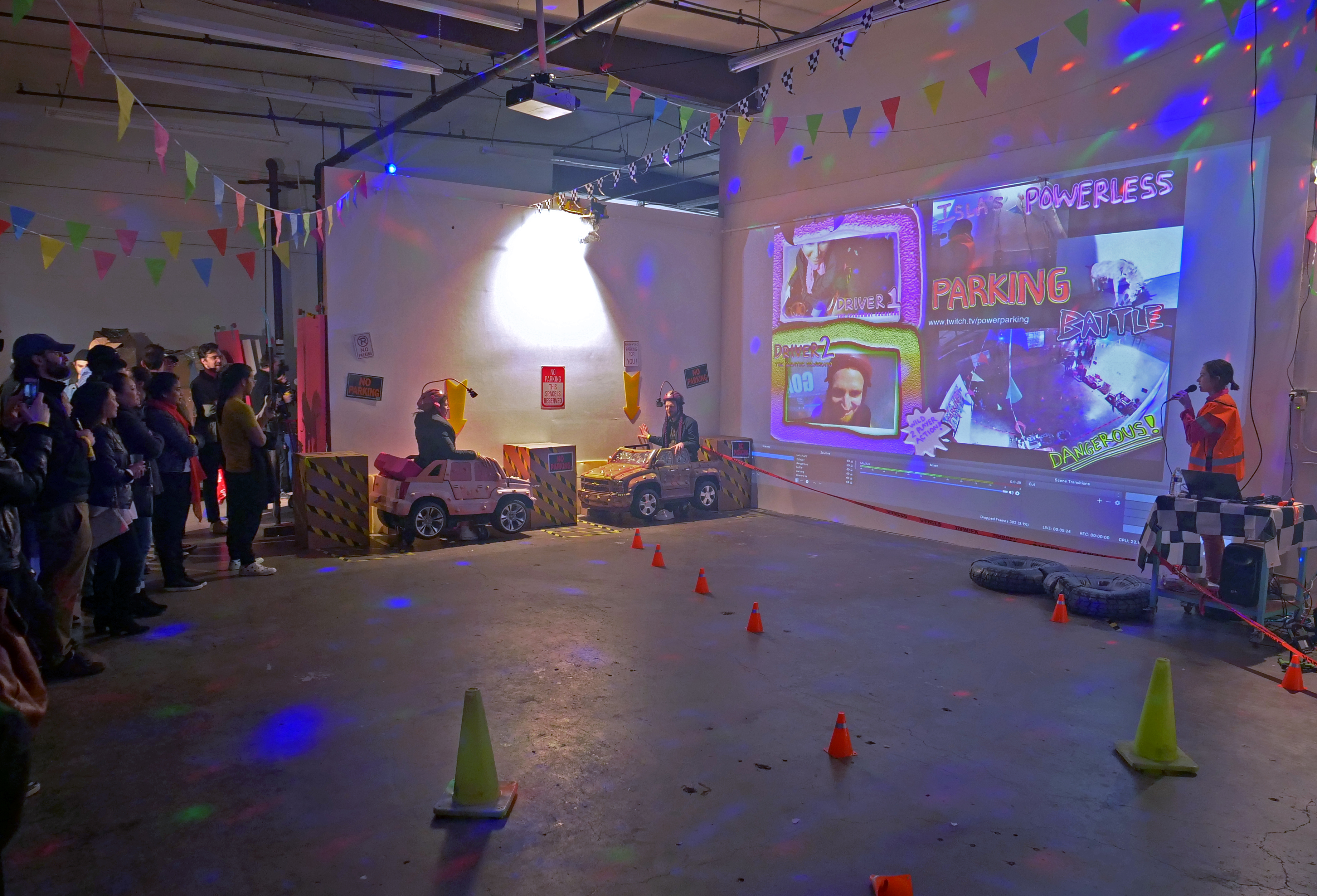 Media: 4 live stream cameras, software, twitch, 2 modified helmets with gopros, 2 modified powerwheels ride-on toys, cones, flags, players.