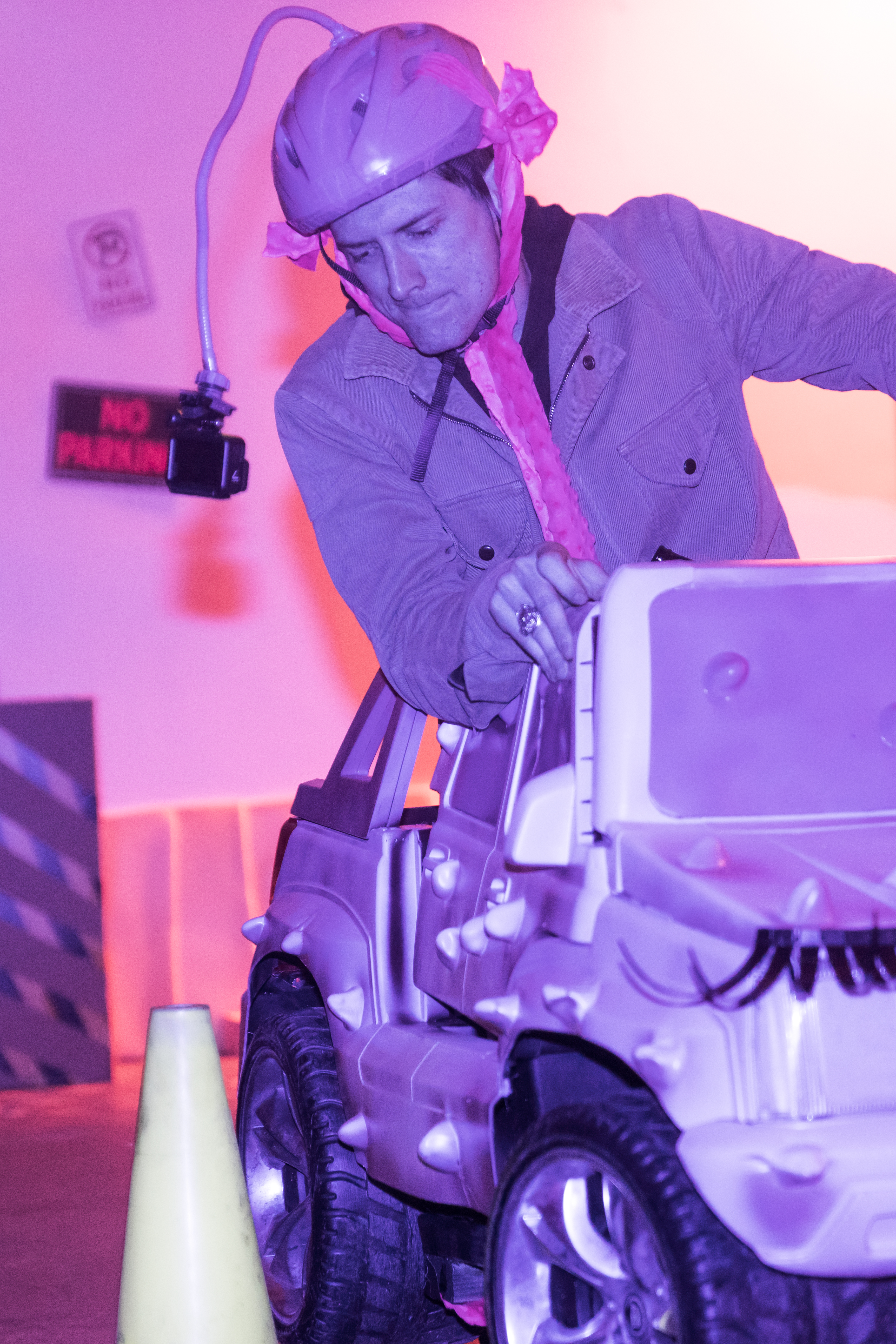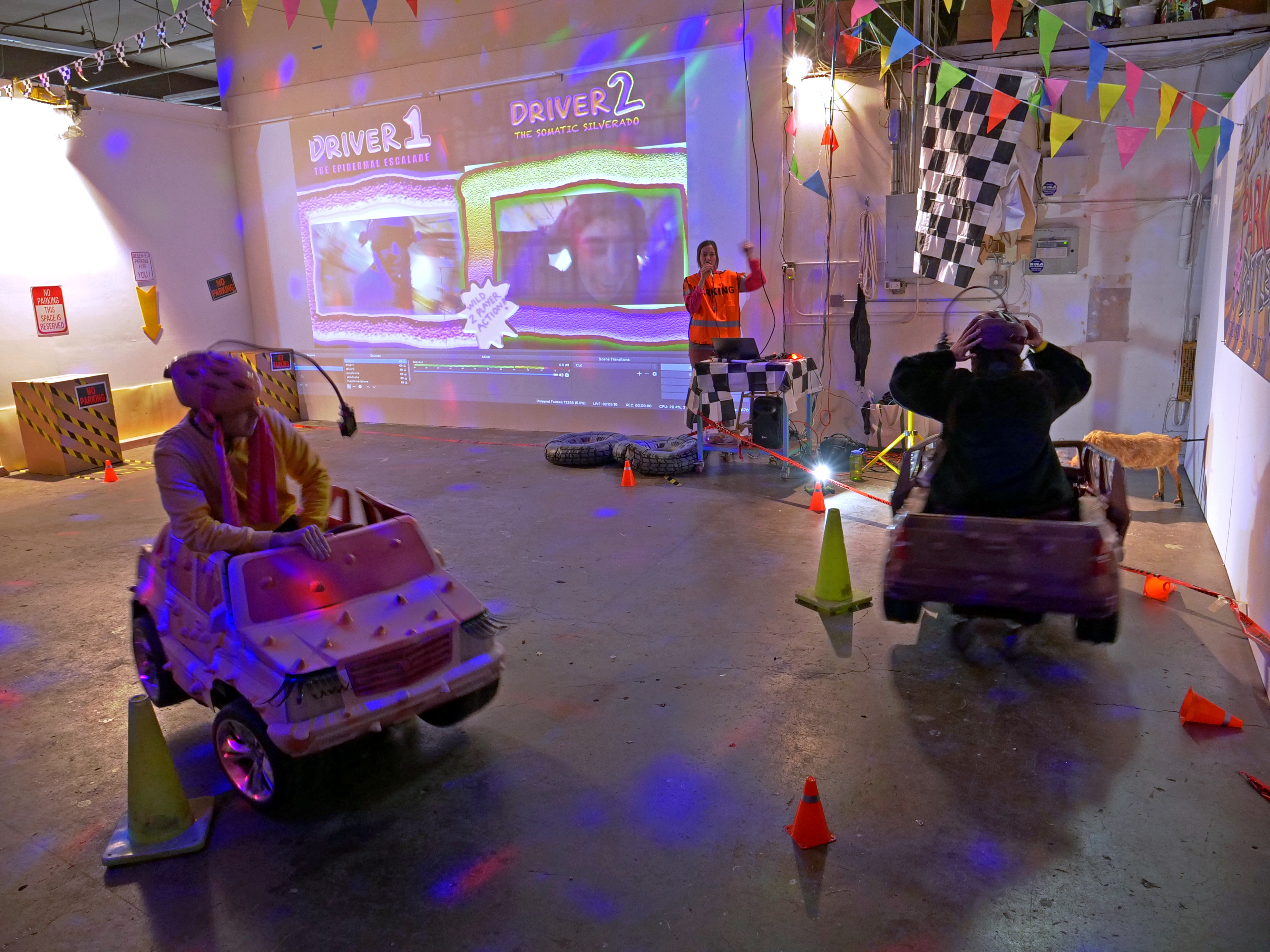 Isla's Powerless Parking Battle Unplugged and Dangerous was a live twitch-streamed 2-player parking battle game. Players were tasked with "driving" modified powerwheels ride-on toys around an obstacle course using their feet to power and steer the vehicles, which had been stripped of their motors and steering. Players donned helmets with attached gopros, live streaming their struggles as they raced to be the first to parallel park. This project was developed for the group show Autobodies, organized by Open Plan Collective , in spring of 2019.