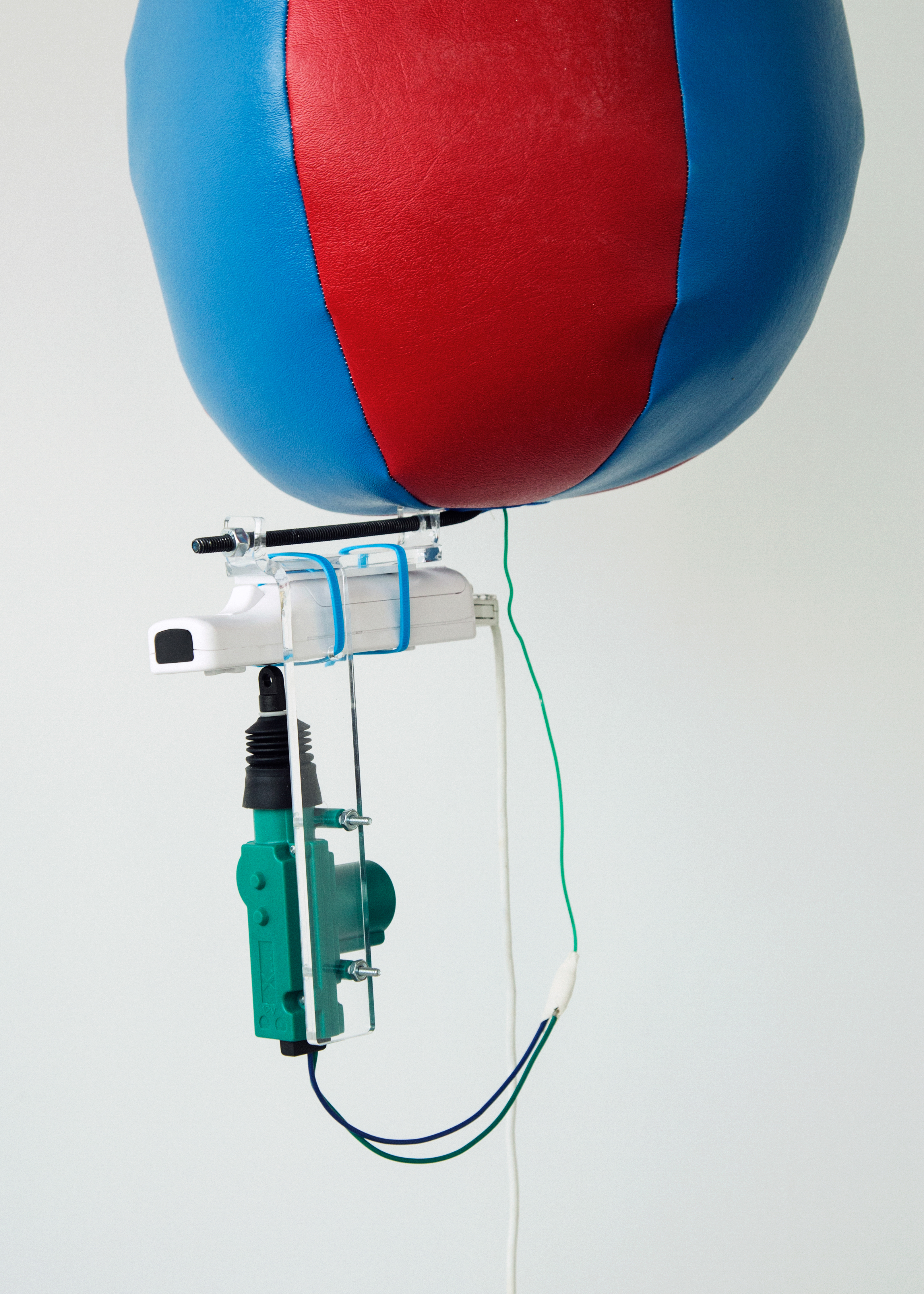Media: Modified punching bag wall mount, motor, custom fabric punching bag, Wii console and controller, car door actuator, Monitor