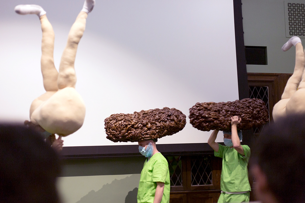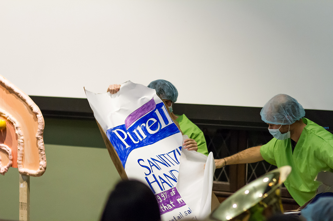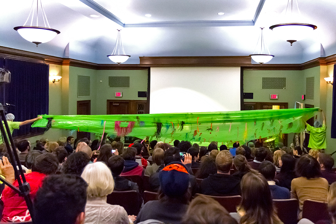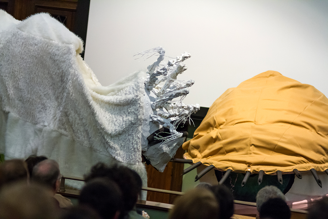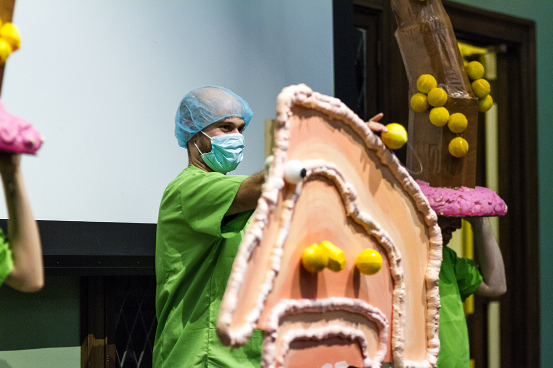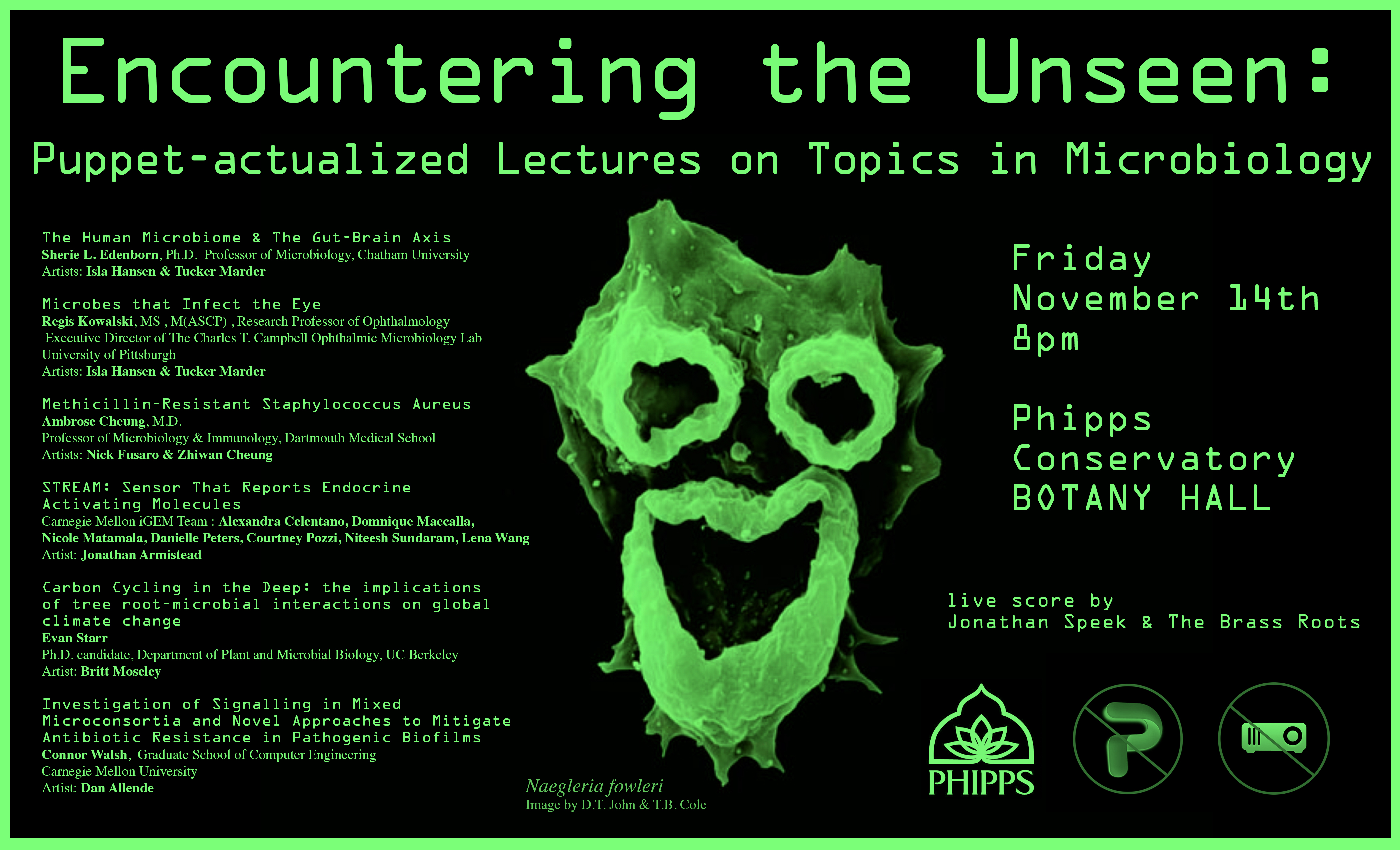 Six speakers or teams of speakers -- professors, doctors, and students from the Pittsburgh area and beyond -- spoke at this colloquium on a specific topic in the field of microbiology. Each lecturer was paired with an artist or group of artists to provide visual accompaniment, real time physical manifestations of the ideas and natural phenomena being discussed, to replace the standard projected powerpoint presentation. Visual performances and effects were created by Isla Hansen, Tucker Marder, Nick Fusaro, Britt Moseley, Jonathan Armistead, Zhiwan Cheung, and Dan Allende. Live theater and kinetic sculpture activated by artists and puppeteers brought microorganisms to life on a much larger scale.