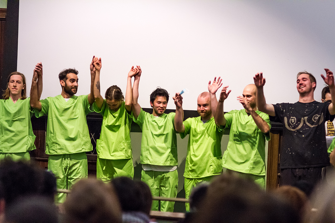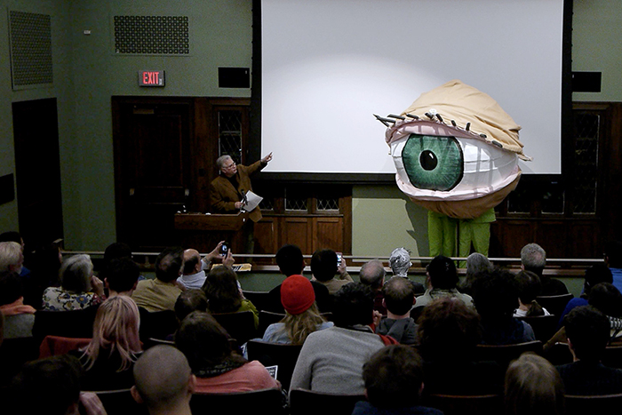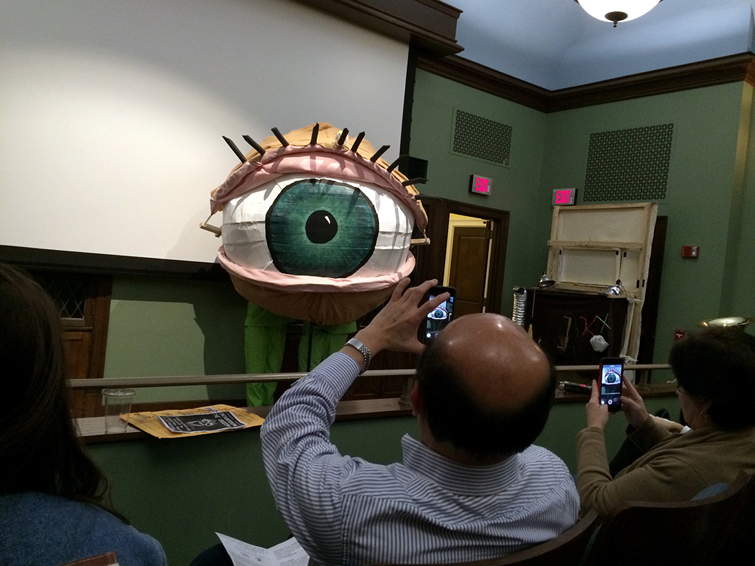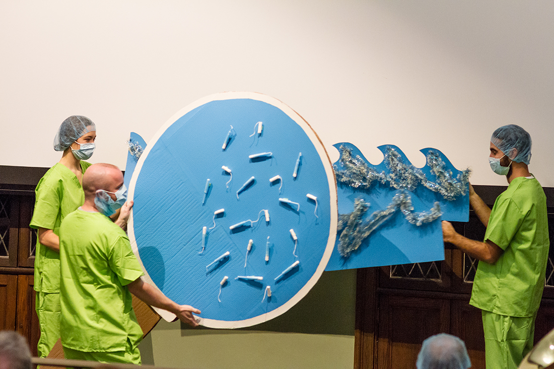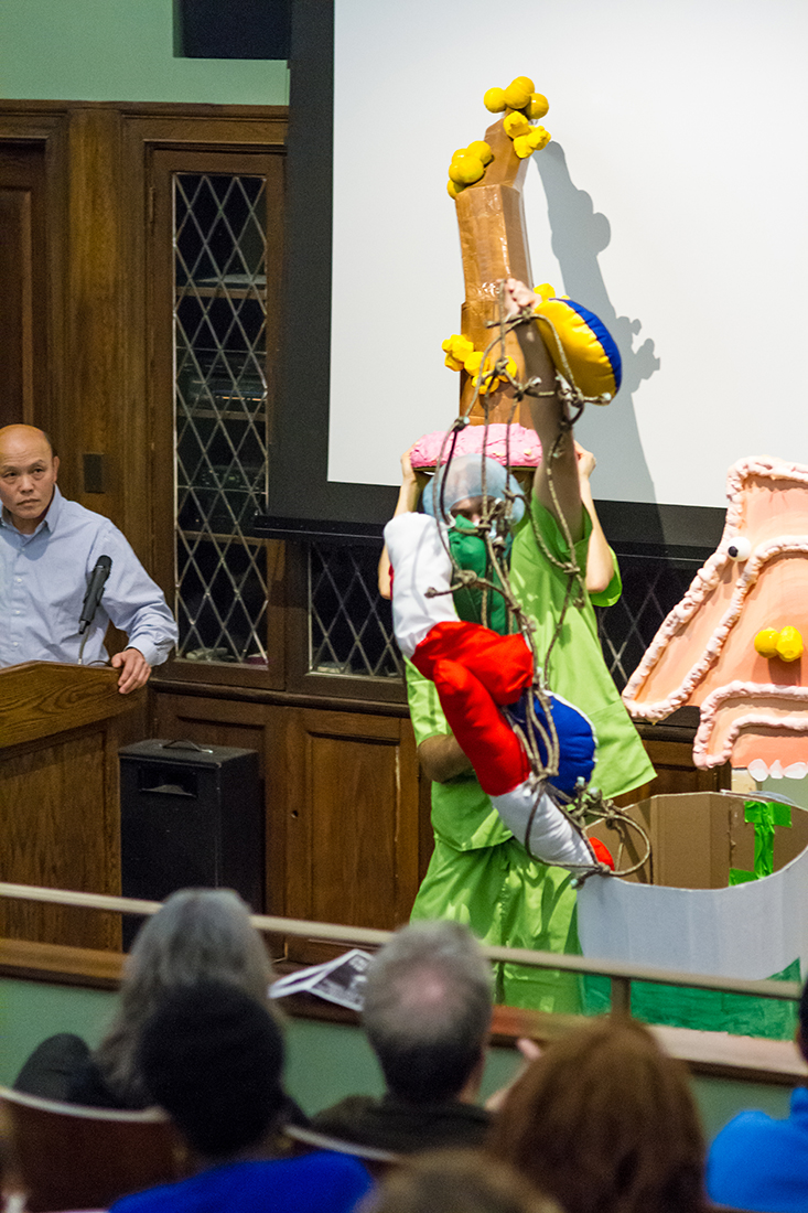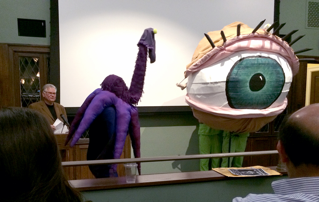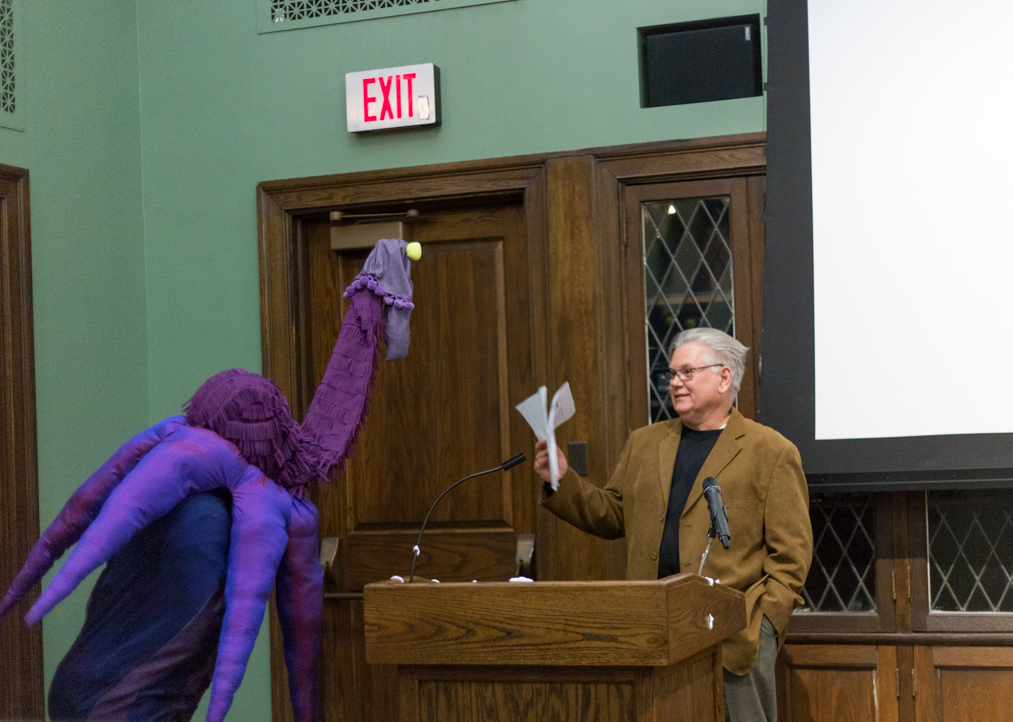 Six speakers or teams of speakers -- professors, doctors, and students from the Pittsburgh area and beyond -- spoke at this colloquium on a specific topic in the field of microbiology. Each lecturer was paired with an artist or group of artists to provide visual accompaniment, real time physical manifestations of the ideas and natural phenomena being discussed, to replace the standard projected powerpoint presentation. Visual performances and effects were created by Isla Hansen, Tucker Marder, Nick Fusaro, Britt Moseley, Jonathan Armistead, Zhiwan Cheung, and Dan Allende. Live theater and kinetic sculpture activated by artists and puppeteers brought microorganisms to life on a much larger scale.