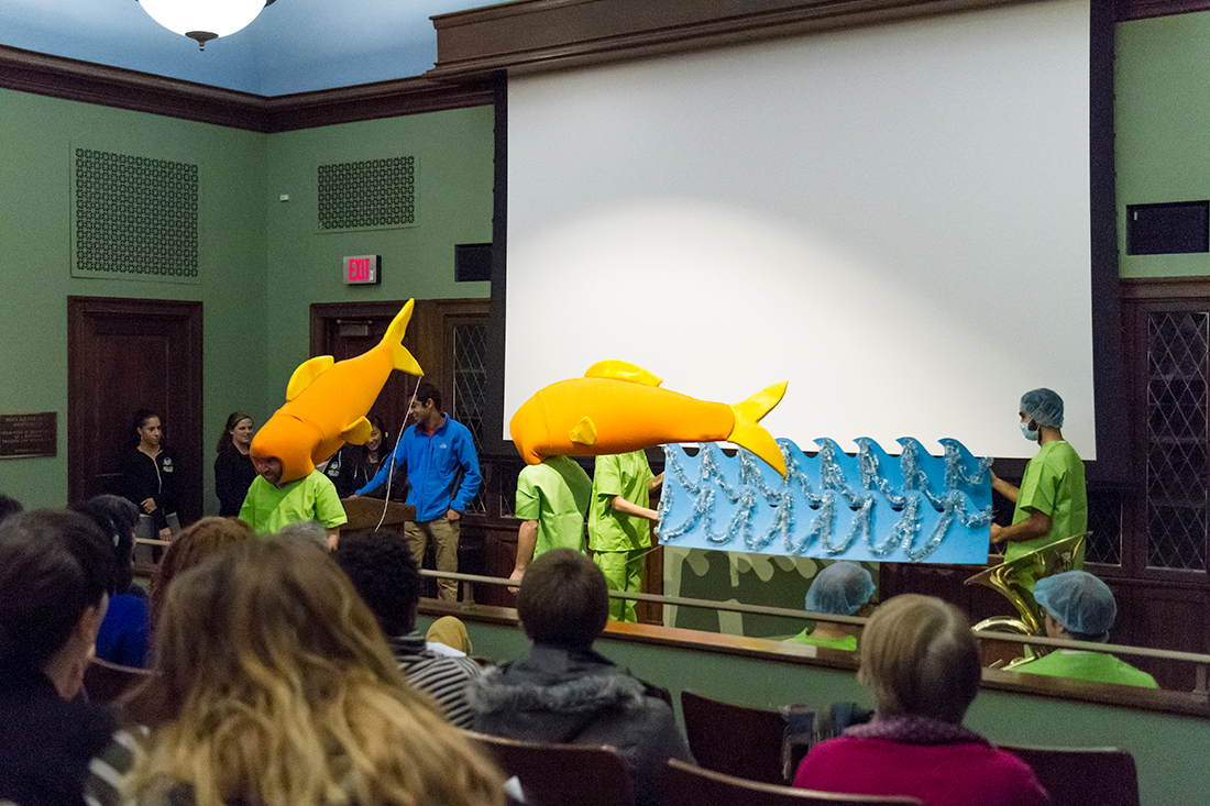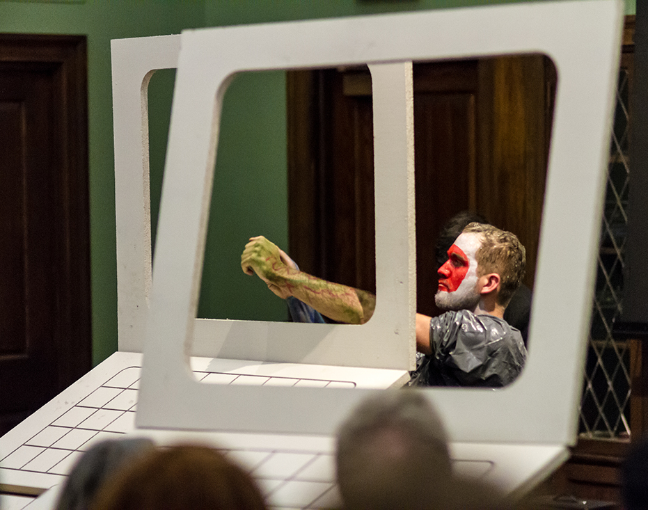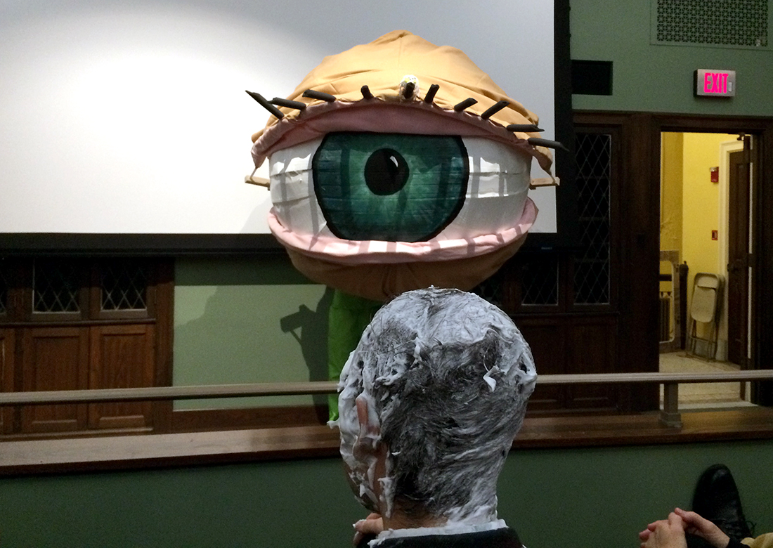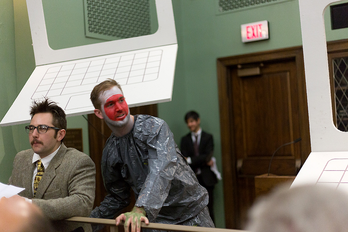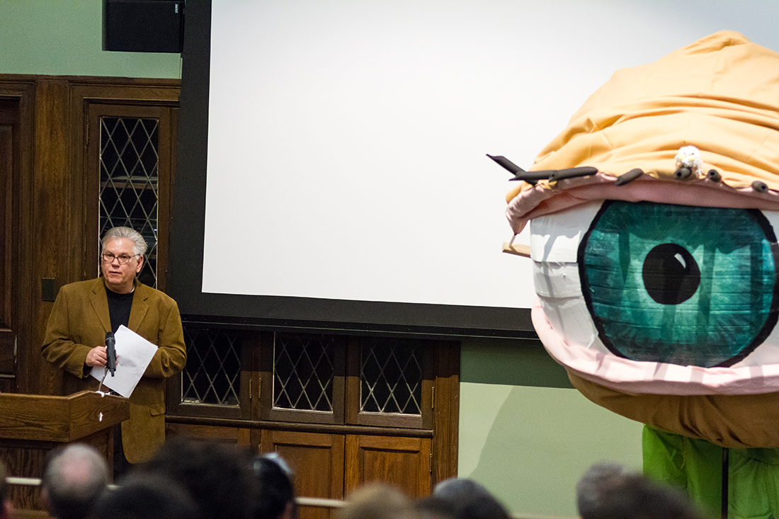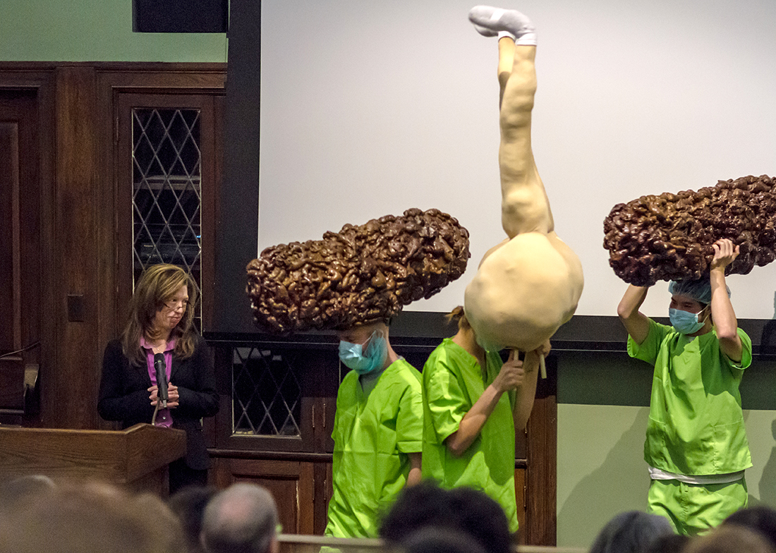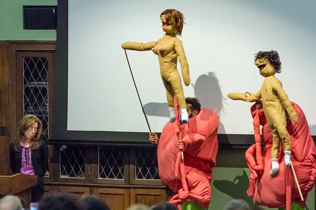 Six speakers or teams of speakers -- professors, doctors, and students from the Pittsburgh area and beyond -- spoke at this colloquium on a specific topic in the field of microbiology. Each lecturer was paired with an artist or group of artists to provide visual accompaniment, real time physical manifestations of the ideas and natural phenomena being discussed, to replace the standard projected powerpoint presentation. Visual performances and effects were created by Isla Hansen, Tucker Marder, Nick Fusaro, Britt Moseley, Jonathan Armistead, Zhiwan Cheung, and Dan Allende. Live theater and kinetic sculpture activated by artists and puppeteers brought microorganisms to life on a much larger scale.