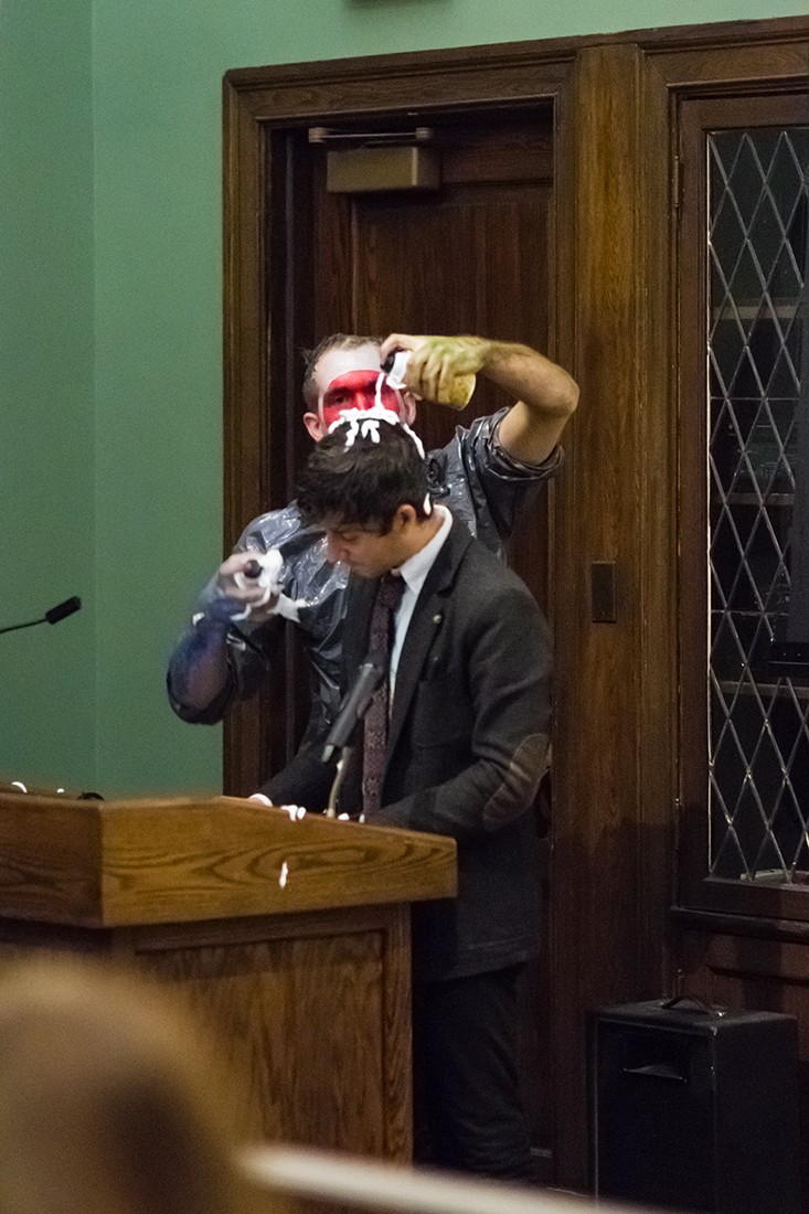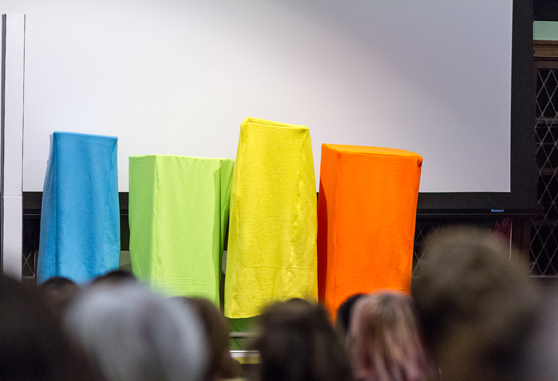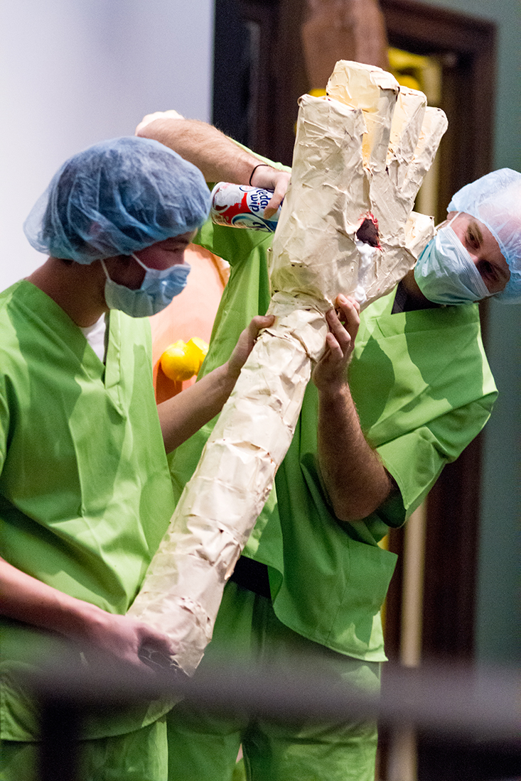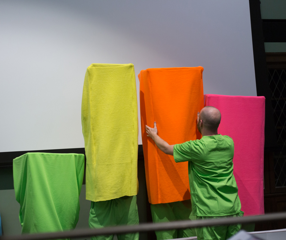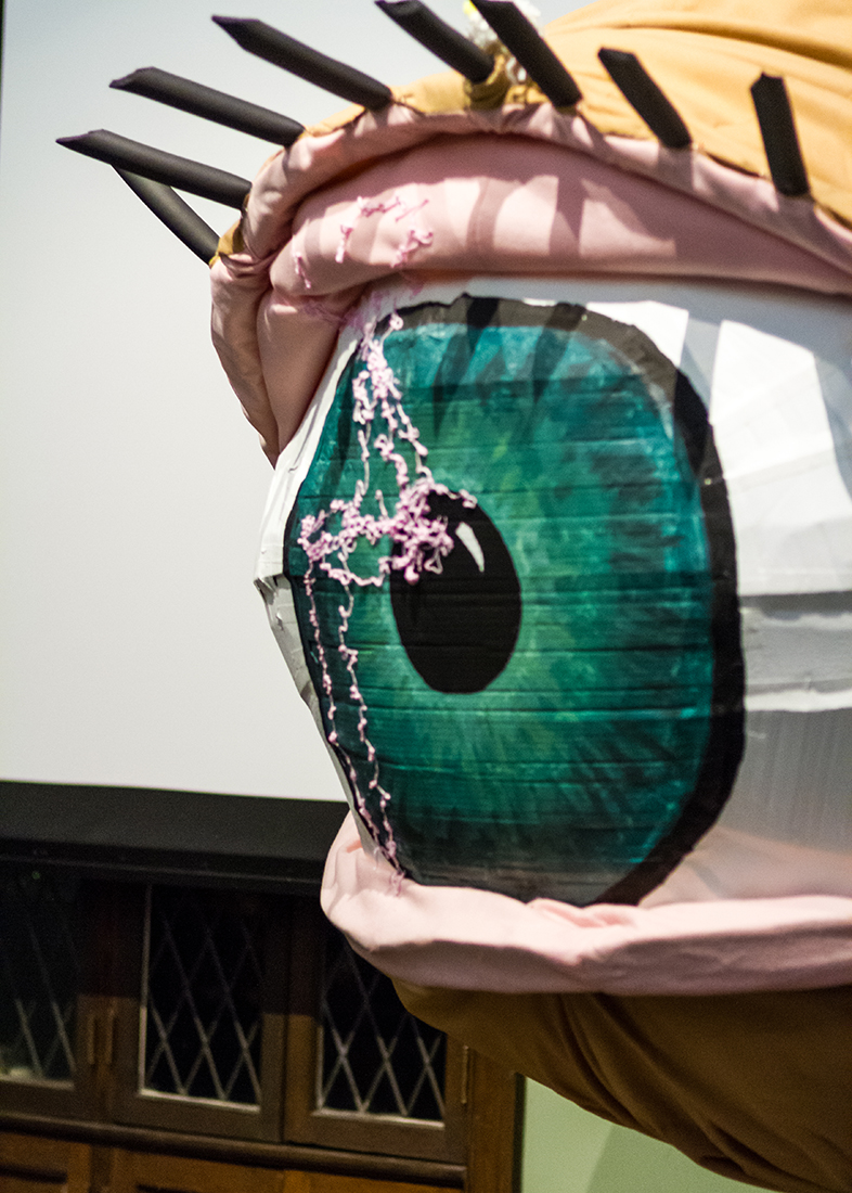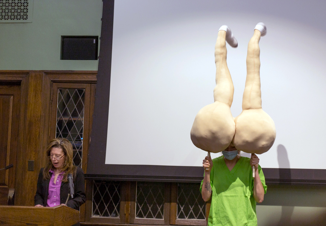Six speakers or teams of speakers -- professors, doctors, and students from the Pittsburgh area and beyond -- spoke at this colloquium on a specific topic in the field of microbiology. Each lecturer was paired with an artist or group of artists to provide visual accompaniment, real time physical manifestations of the ideas and natural phenomena being discussed, to replace the standard projected powerpoint presentation. Visual performances and effects were created by Isla Hansen, Tucker Marder, Nick Fusaro, Britt Moseley, Jonathan Armistead, Zhiwan Cheung, and Dan Allende. Live theater and kinetic sculpture activated by artists and puppeteers brought microorganisms to life on a much larger scale.