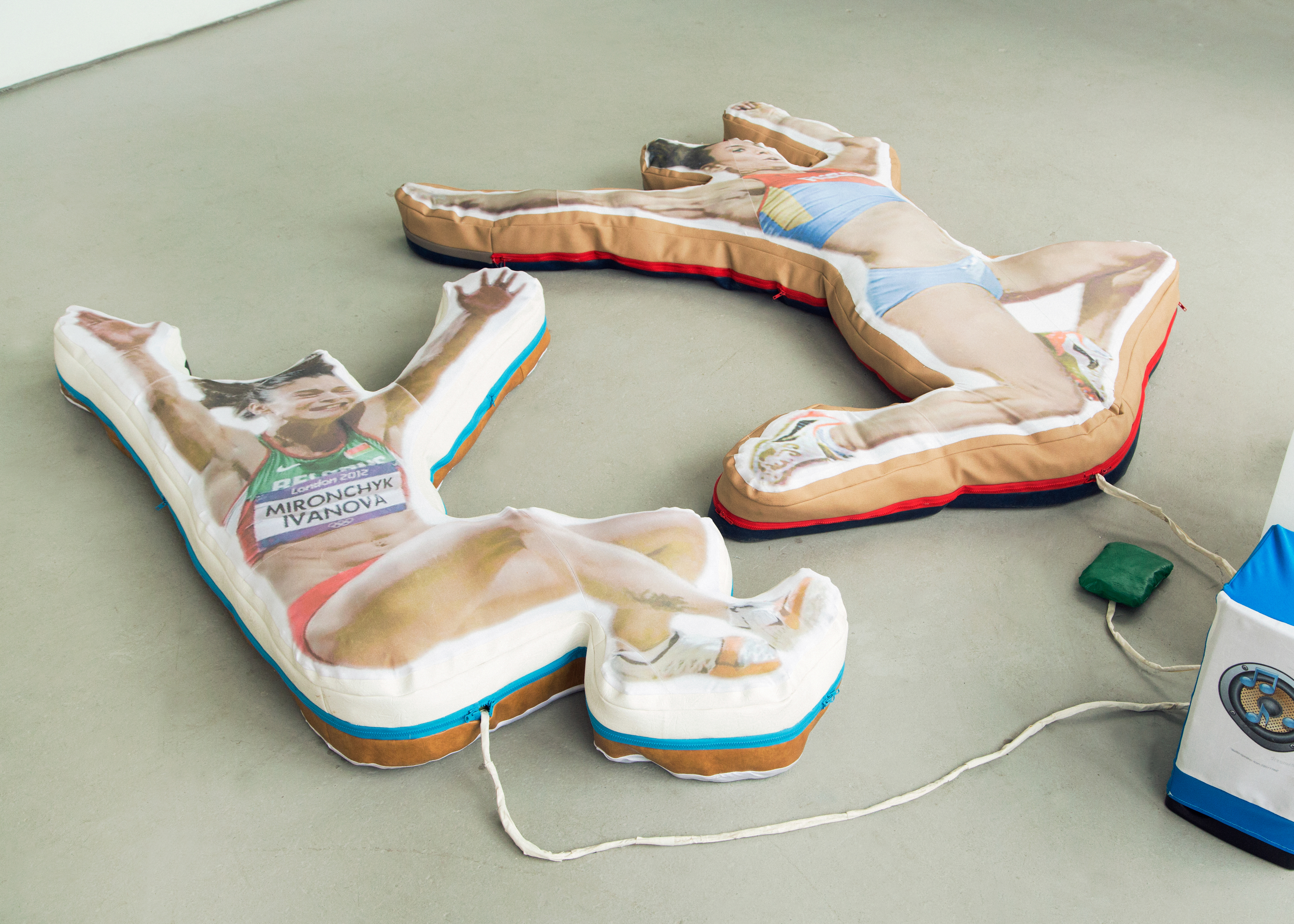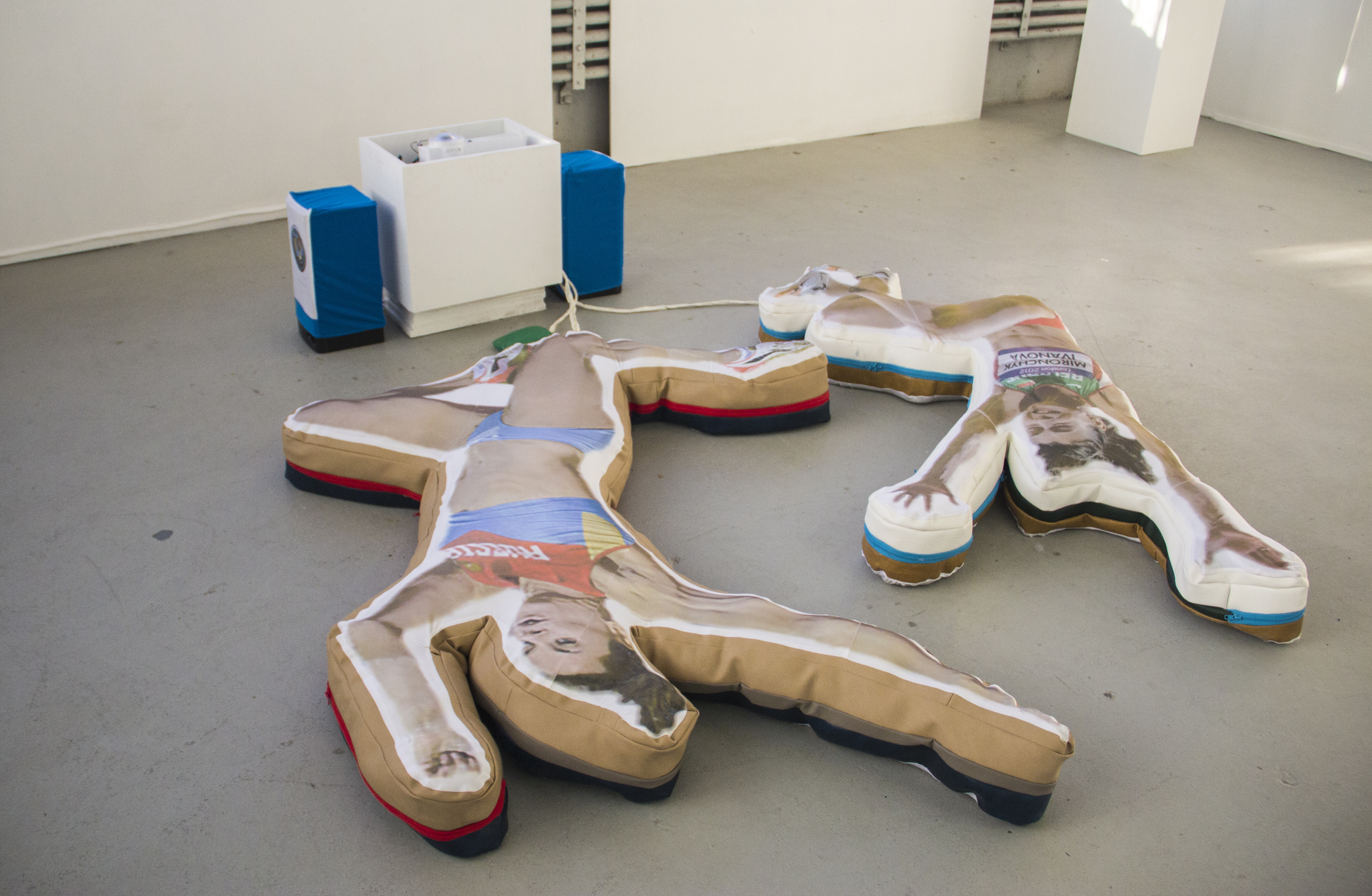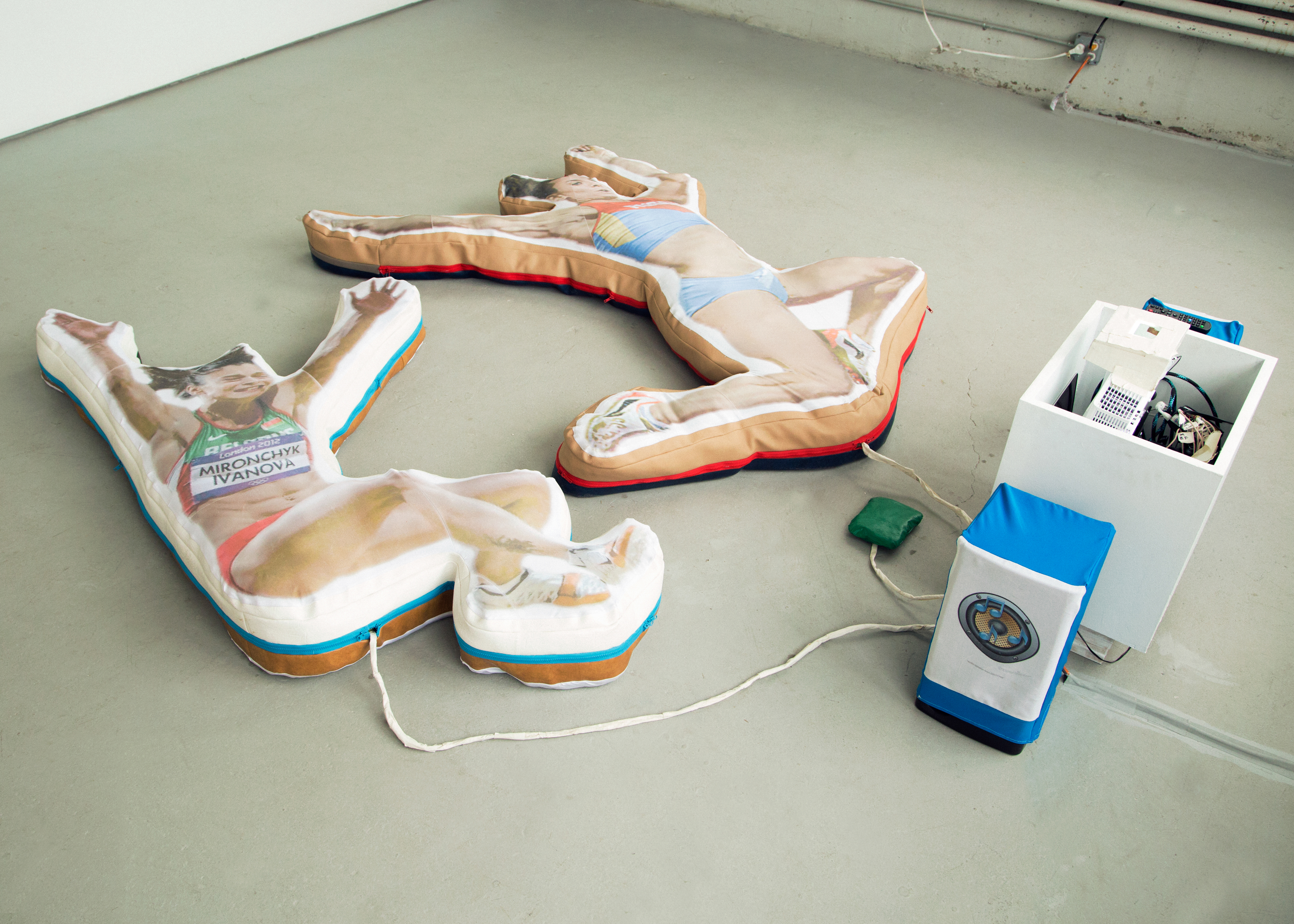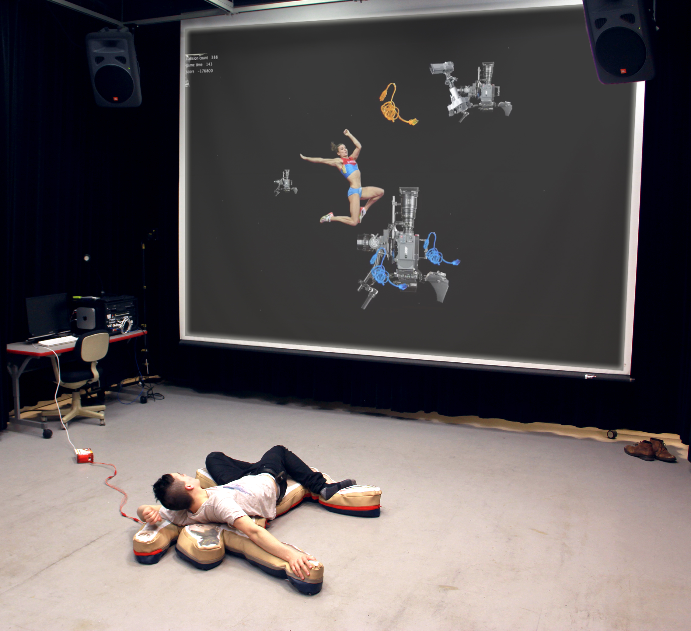 The controllers, constructed like exercise mats, are designed to hold the player’s body in one specific position, mimicking famous eastern european female athletes at the height of their jumps. To play, two players control the movement and sight lines of one player-character. The concept of the game is that you play as a hybrid russian female athlete running from the ghost of infamous filmmaker Leni Riefenstahl as represented by german shepherds riding drones. The track and field environment is littered with potholes dug by Leni so she could photograph you, but you keep falling into them. You are constantly looking for sources of protein and attempting to avoid an airplane crash that keeps reoccuring in the space.