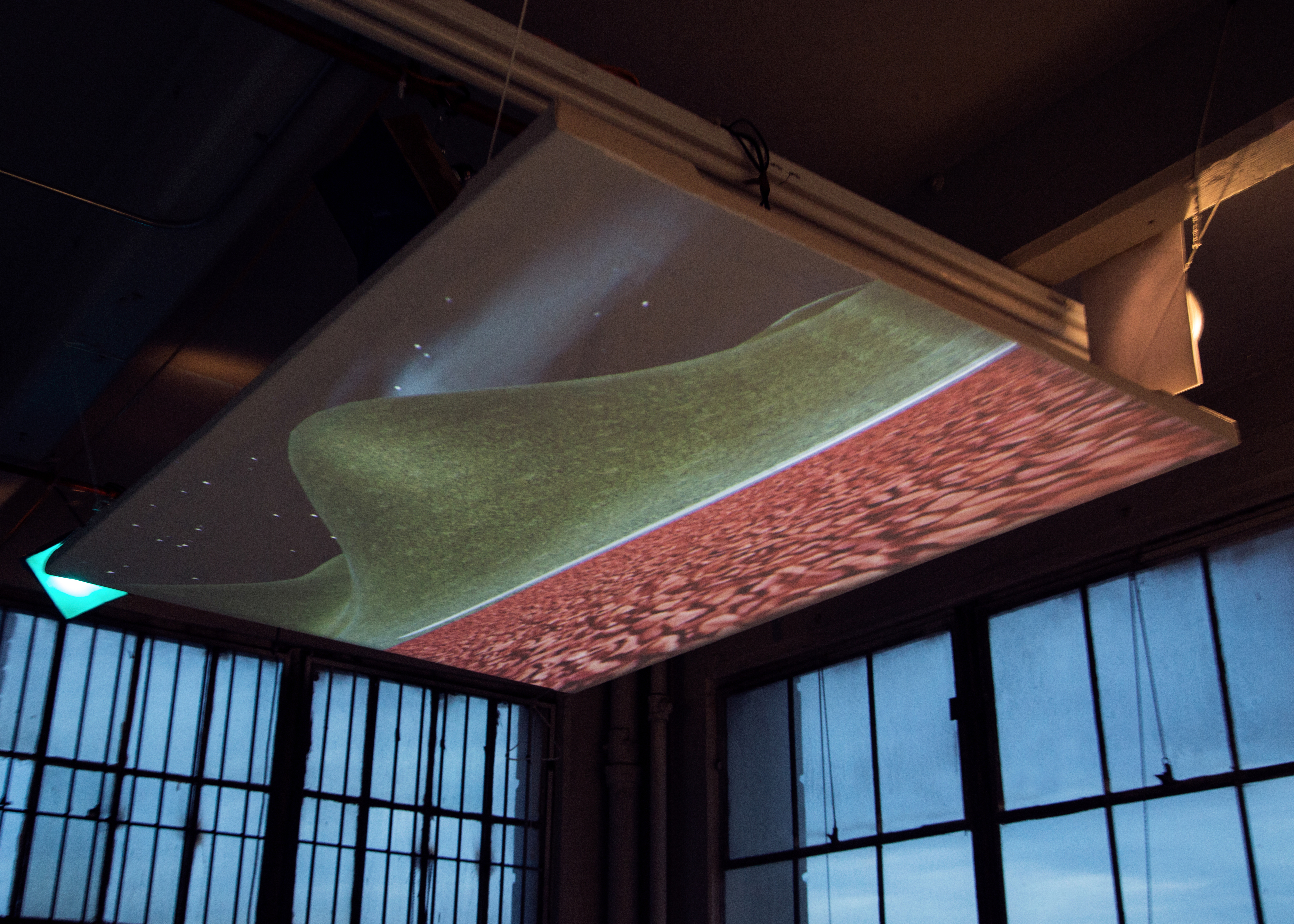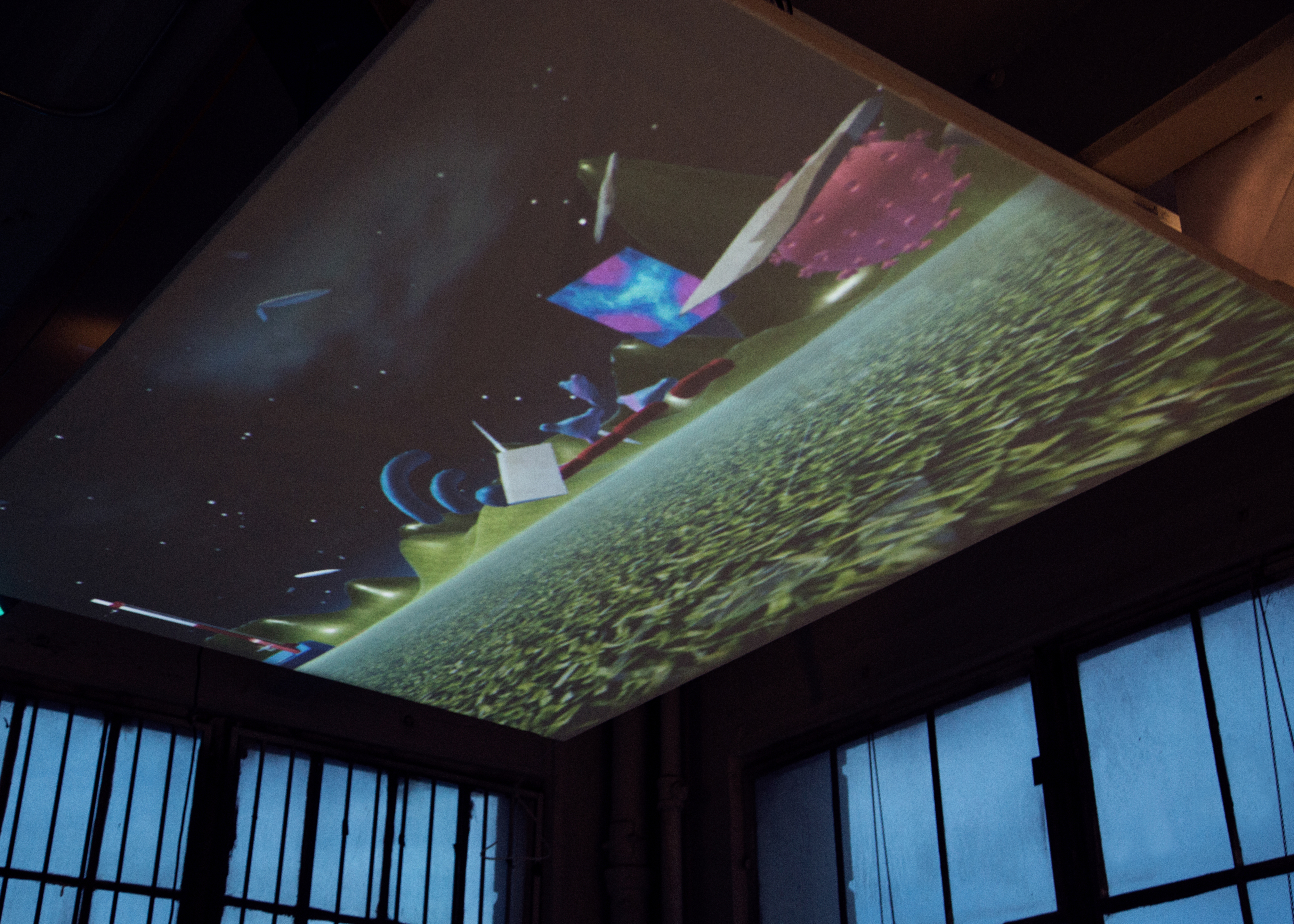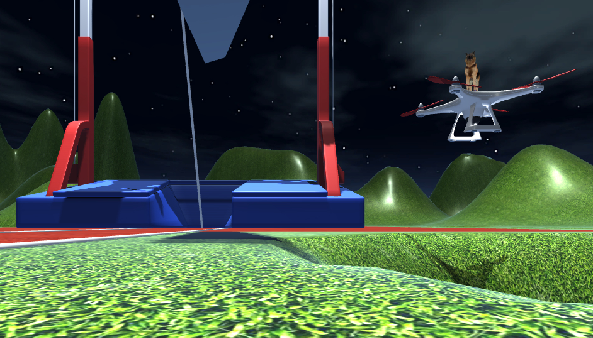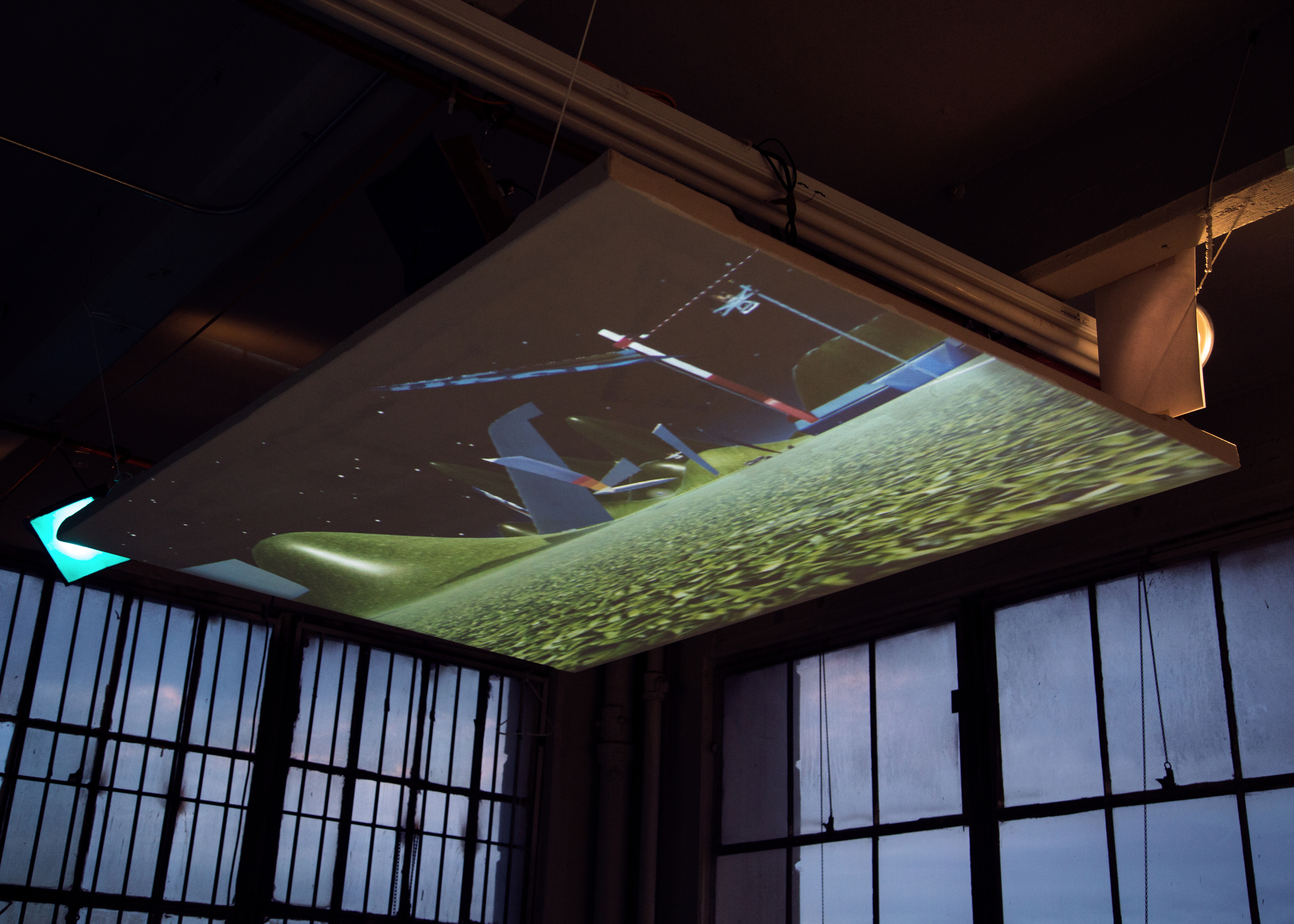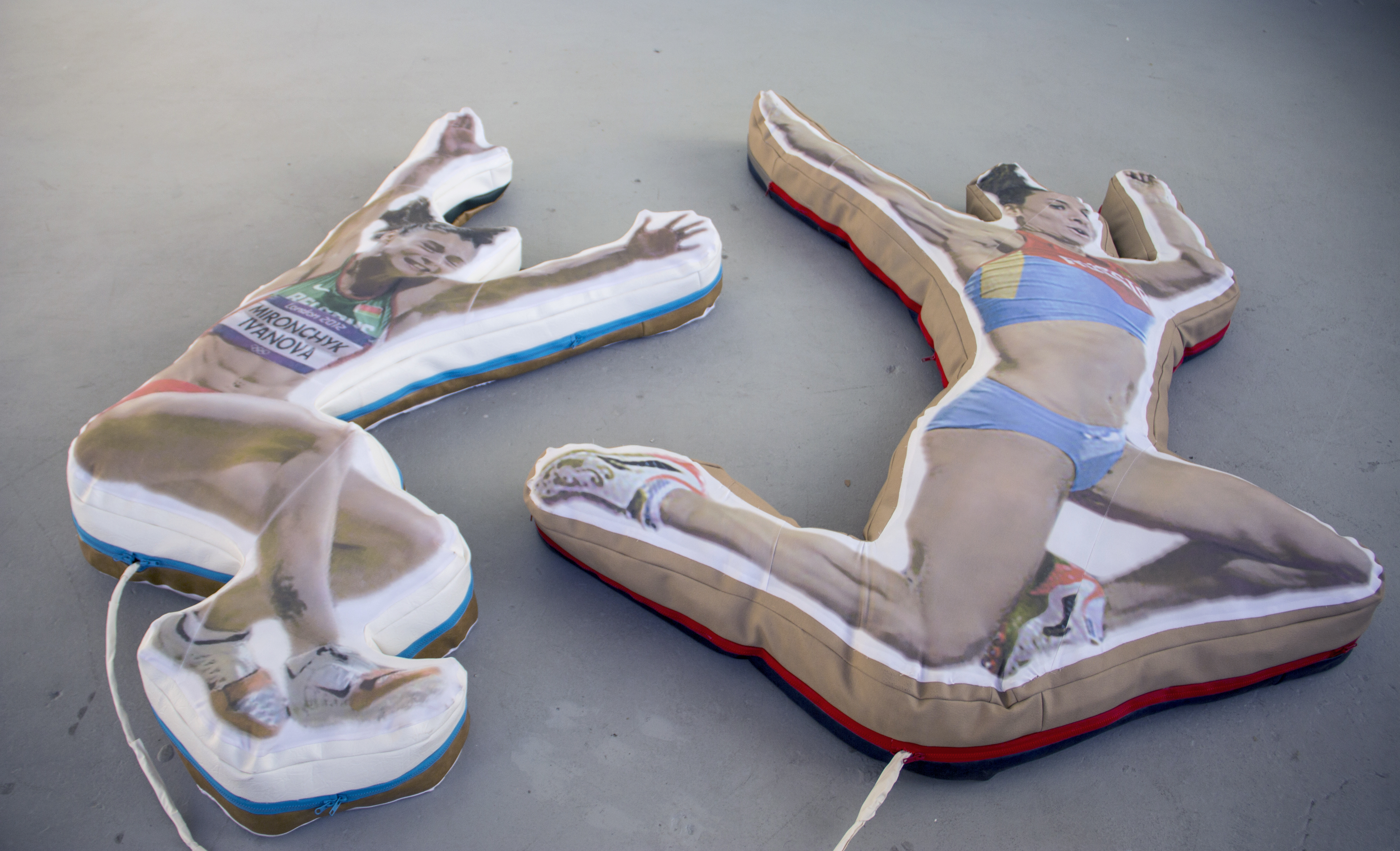 The controllers, constructed like exercise mats, are designed to hold the player’s body in one specific position, mimicking famous eastern european female athletes at the height of their jumps. To play, two players control the movement and sight lines of one player-character. The concept of the game is that you play as a hybrid russian female athlete running from the ghost of infamous filmmaker Leni Riefenstahl as represented by german shepherds riding drones. The track and field environment is littered with potholes dug by Leni so she could photograph you, but you keep falling into them. You are constantly looking for sources of protein and attempting to avoid an airplane crash that keeps reoccuring in the space.